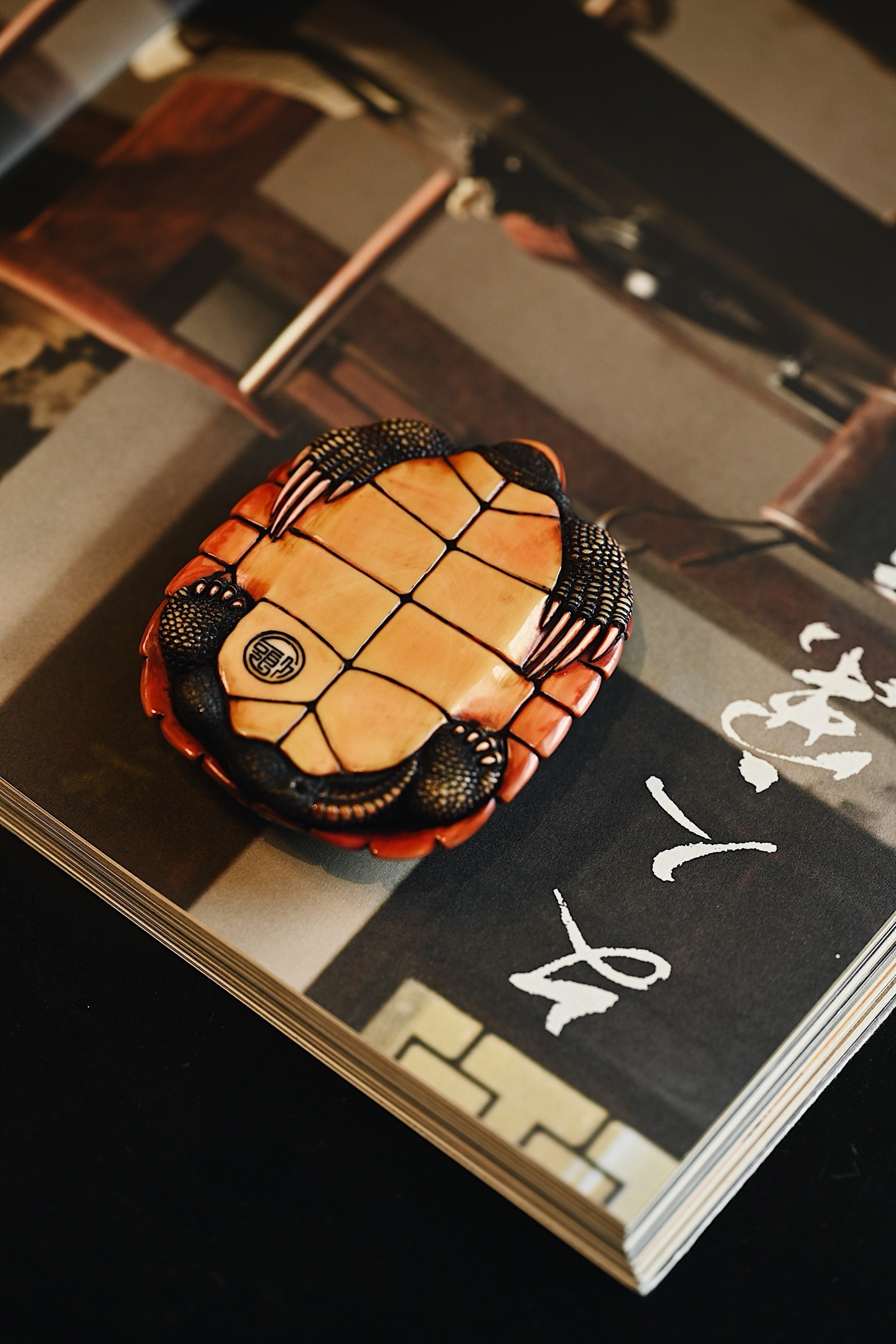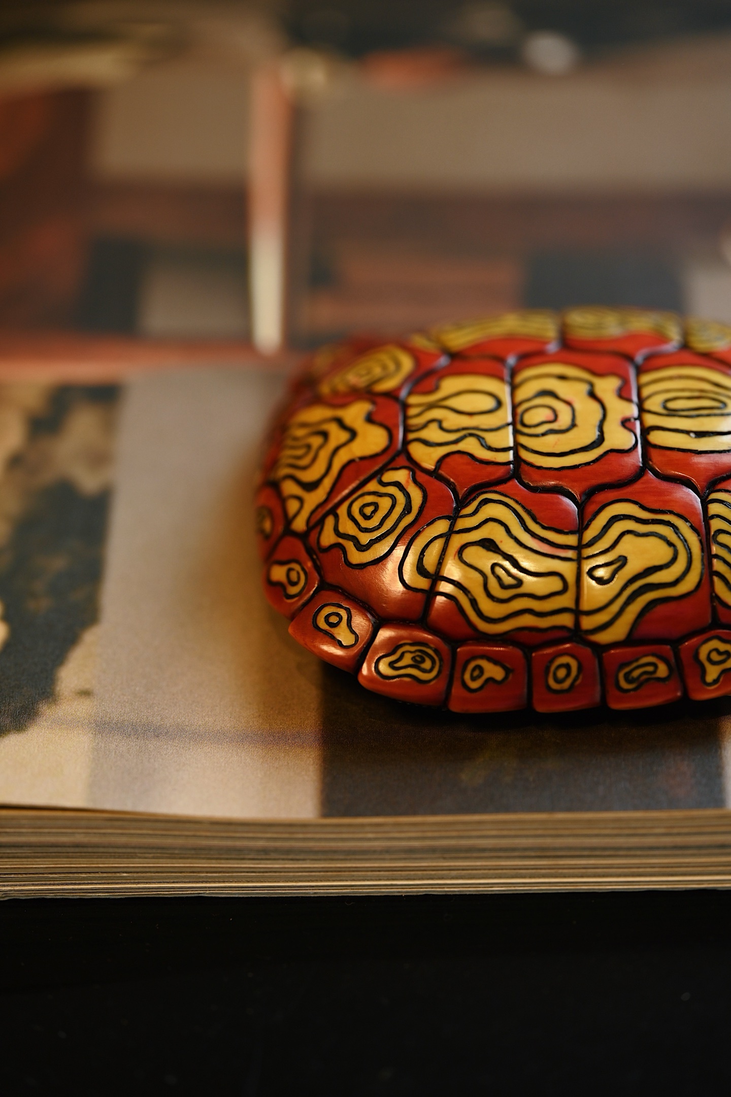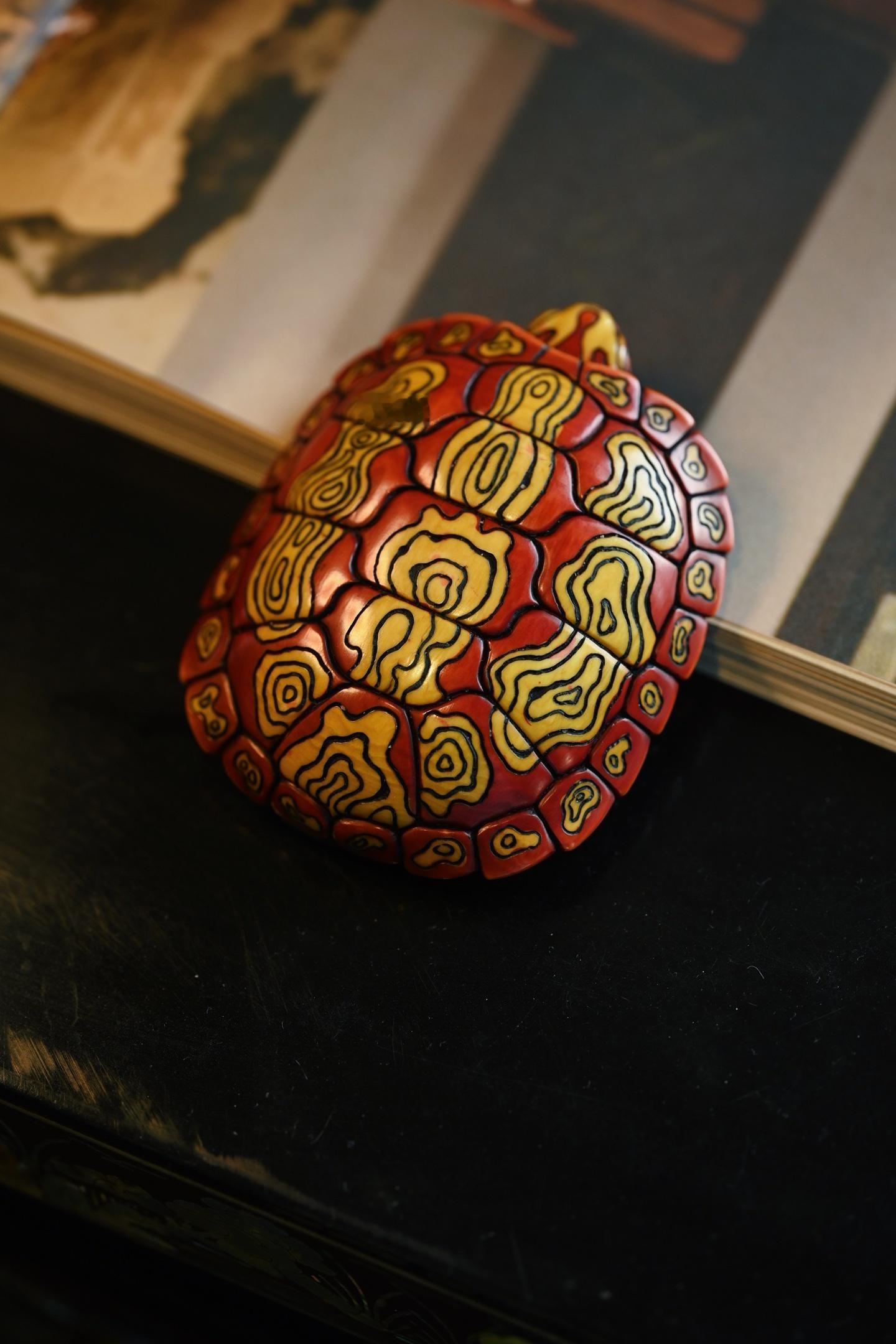 以整料精雕而成,取时下热门的“蜡笔巴西龟”为原型,造型写实,龟甲纹理、鳞甲细节刻画入微,龟身色彩明艳饱满,层次分明;眼部神态刻画传神,整体栩栩如生,集观赏、把玩、潮流文化与吉祥寓意于一体。