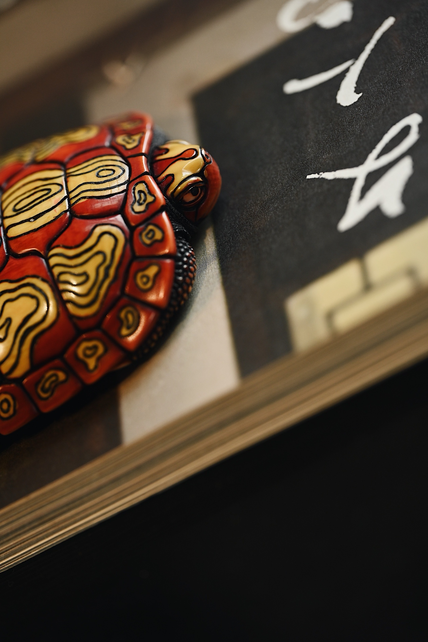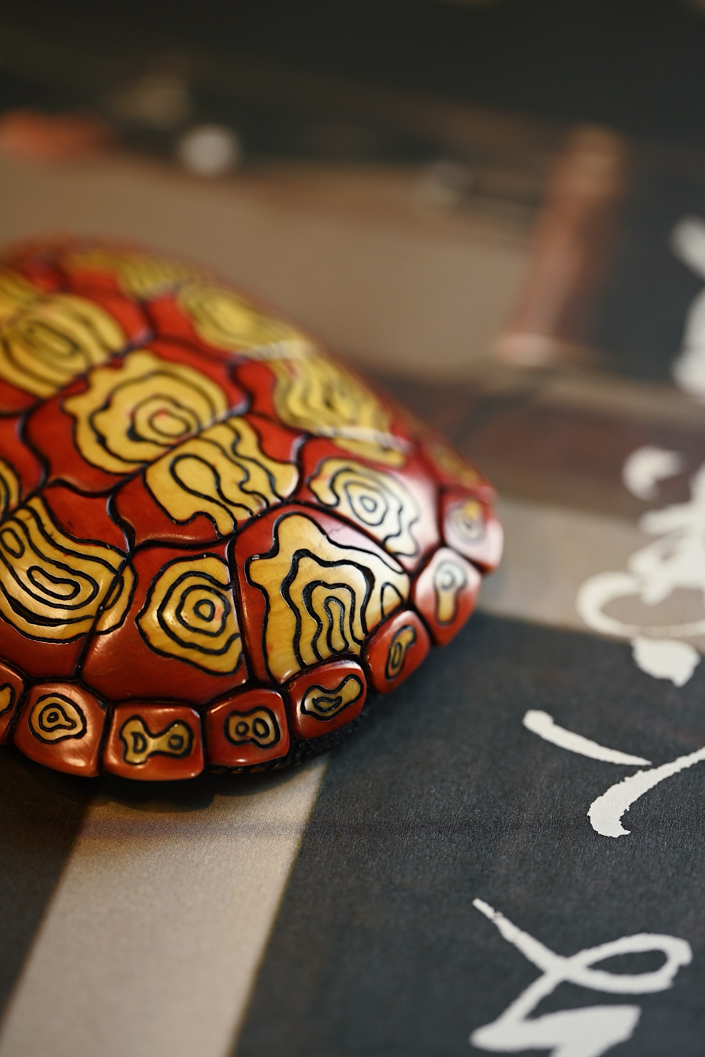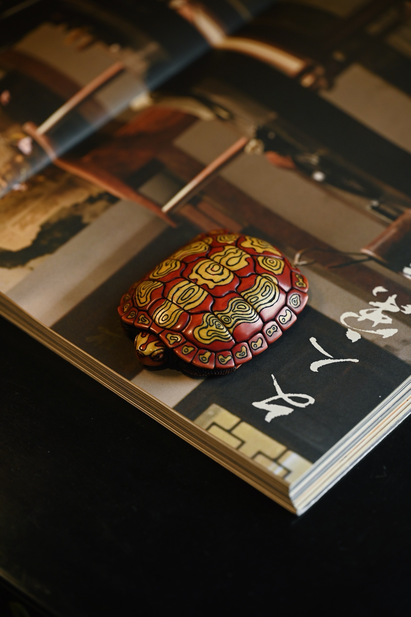 以整料精雕而成,取时下热门的“蜡笔巴西龟”为原型,造型写实,龟甲纹理、鳞甲细节刻画入微,龟身色彩明艳饱满,层次分明;眼部神态刻画传神,整体栩栩如生,集观赏、把玩、潮流文化与吉祥寓意于一体。