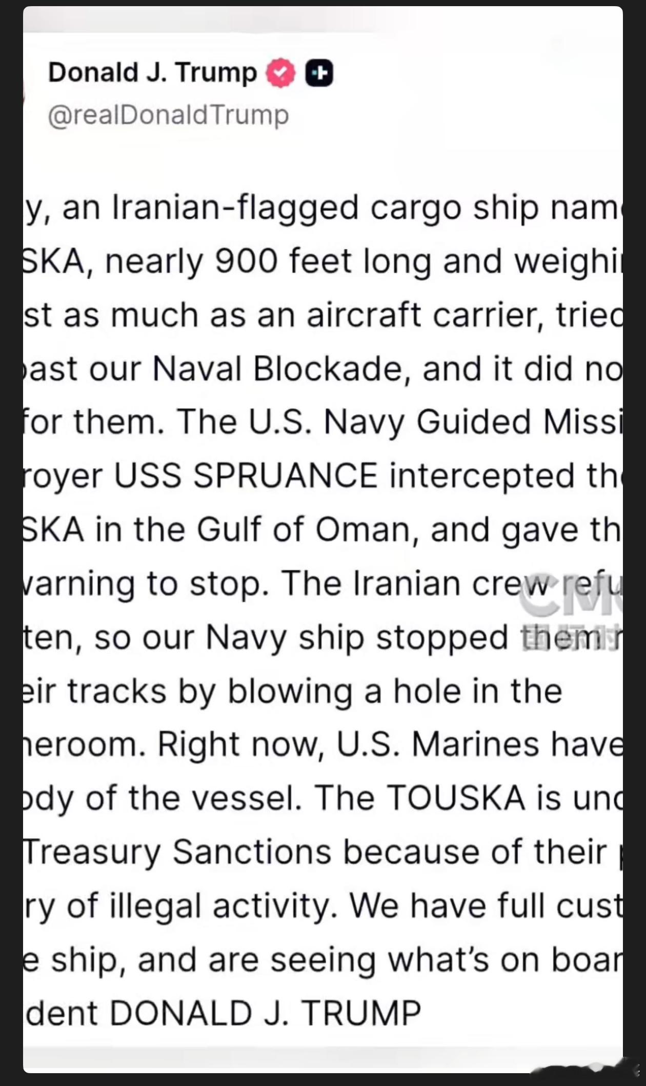 美军武力拦截伊朗货船美国一边在中东推动和谈营造和平表象,一边却出尔反尔搞军事拦截。特朗普宣称美军武力控制伊朗货船,这是典型的霸权行径。此前伊朗就指出其海上封锁是“海盗行为”。美国此举严重破坏地区稳定,让和平努力付诸东流,尽显其丑恶嘴脸。