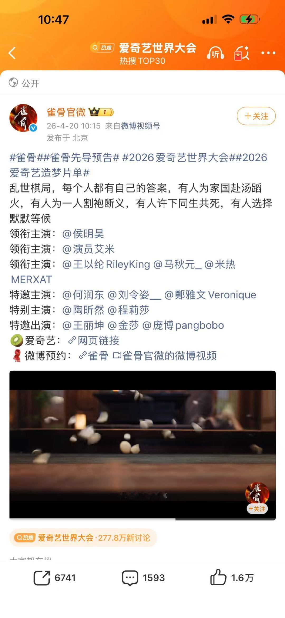 侯明昊两部剧发预告侯明昊一天宣传两部戏爱奇艺世界大会 被侯明昊的营业速度惊到!爱奇艺世界大会《碧血蝉》《雀骨》双双释出预告,一天宣传两部戏,每一个角色都让人狠狠期待!