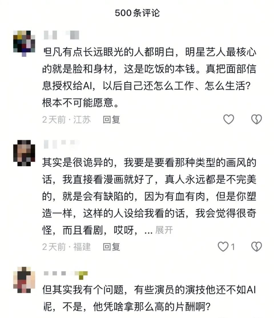 如果演员也用AI代替,那这个行业也就穷途末路了…这样一来以后是不是也不需要观众了?没有人的文明是没有意义的,没有真情实感的故事那还不如不看。