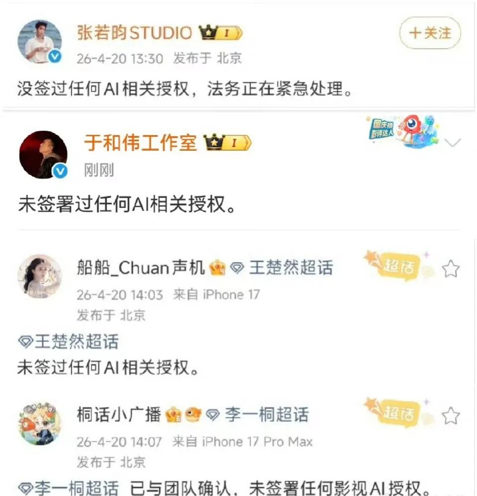 张若昀、于和伟等工作室紧急辟谣未签署任何AI授权,立即撇清关系。