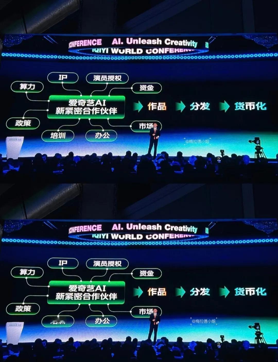 4月20日,爱奇艺CEO龚宇在世界大会上公开表示:“AI影视化无法阻挡,演员常因拍戏数月没有个人生活,而AI技术可让演员从年拍4部戏增至14部,并获得更多休息时间”,更预测“真人实拍未来可能成为非物质文化遗产”。并且大会宣布陈哲远、丞磊、曾舜晞等117位艺人已签署AI艺人库协议,允许平台使用其肖像、声音生成虚拟演员,遭网友抵.制。