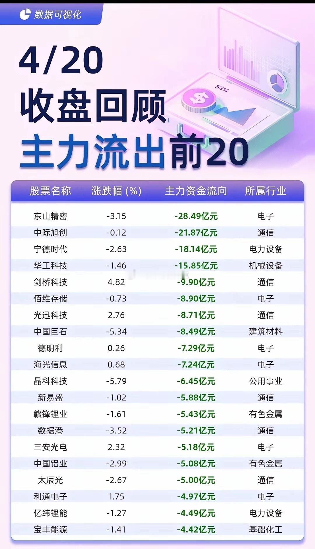 4月20日A股资金动向一览:进攻端:电子、国防军工、通信三大板块霸榜流入前20,AI算力、卫星链的资金抱团趋势已经形成,短期主线非常明确。防御端:电力设备、有色等顺周期板块集体被抛售,资金对传统成长赛道的信心正在快速降温。核心观点:当前市场是典型的“结构性牛市+结构性熊市”,主线里的资金虹吸效应极强,非主线标的很容易被边缘化,操作上必须“聚焦主线、快进快出”。