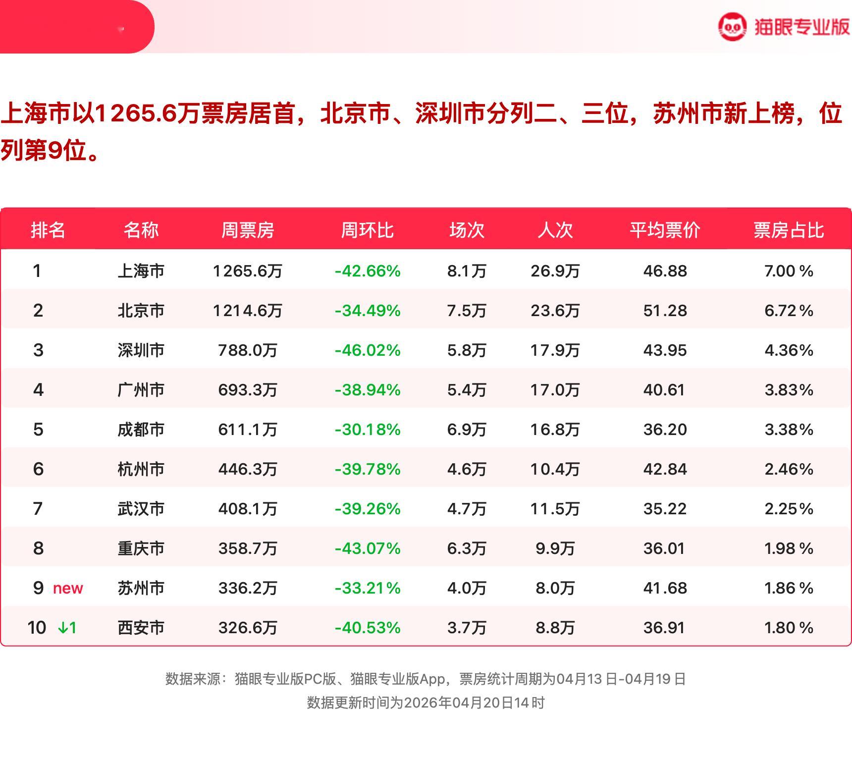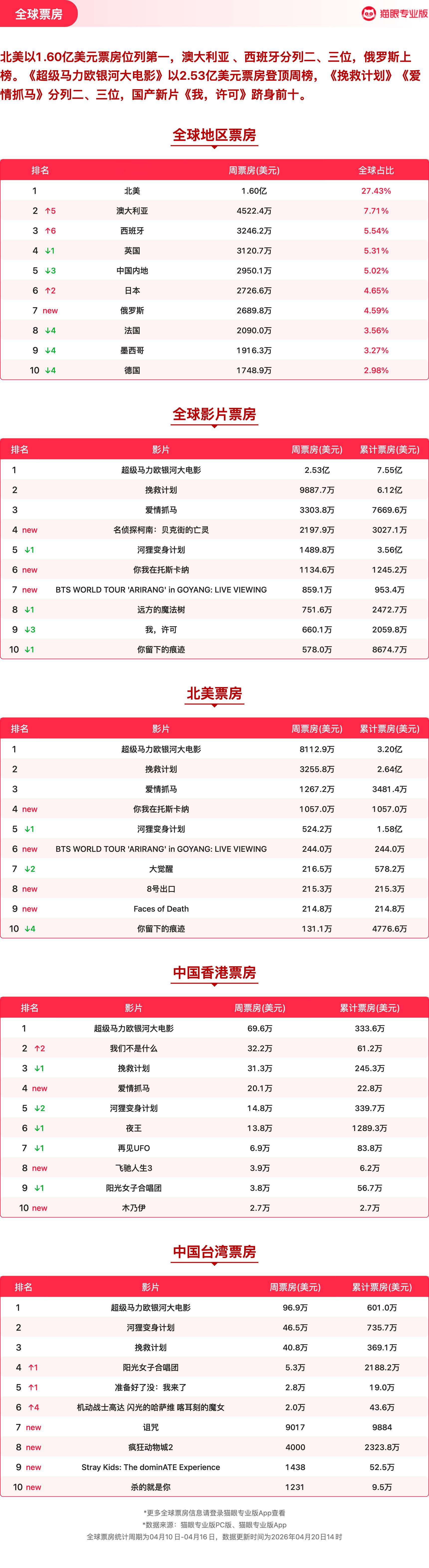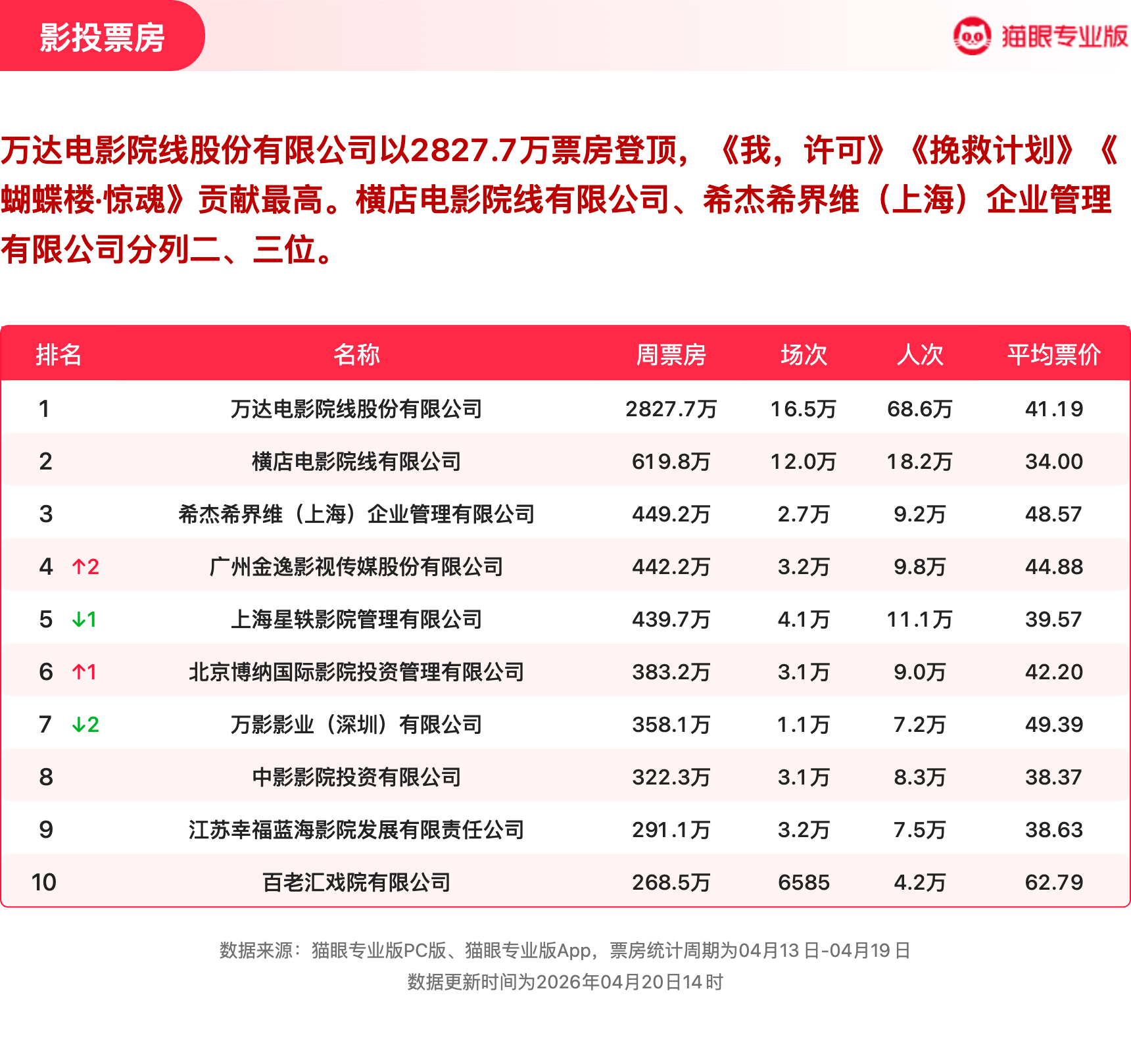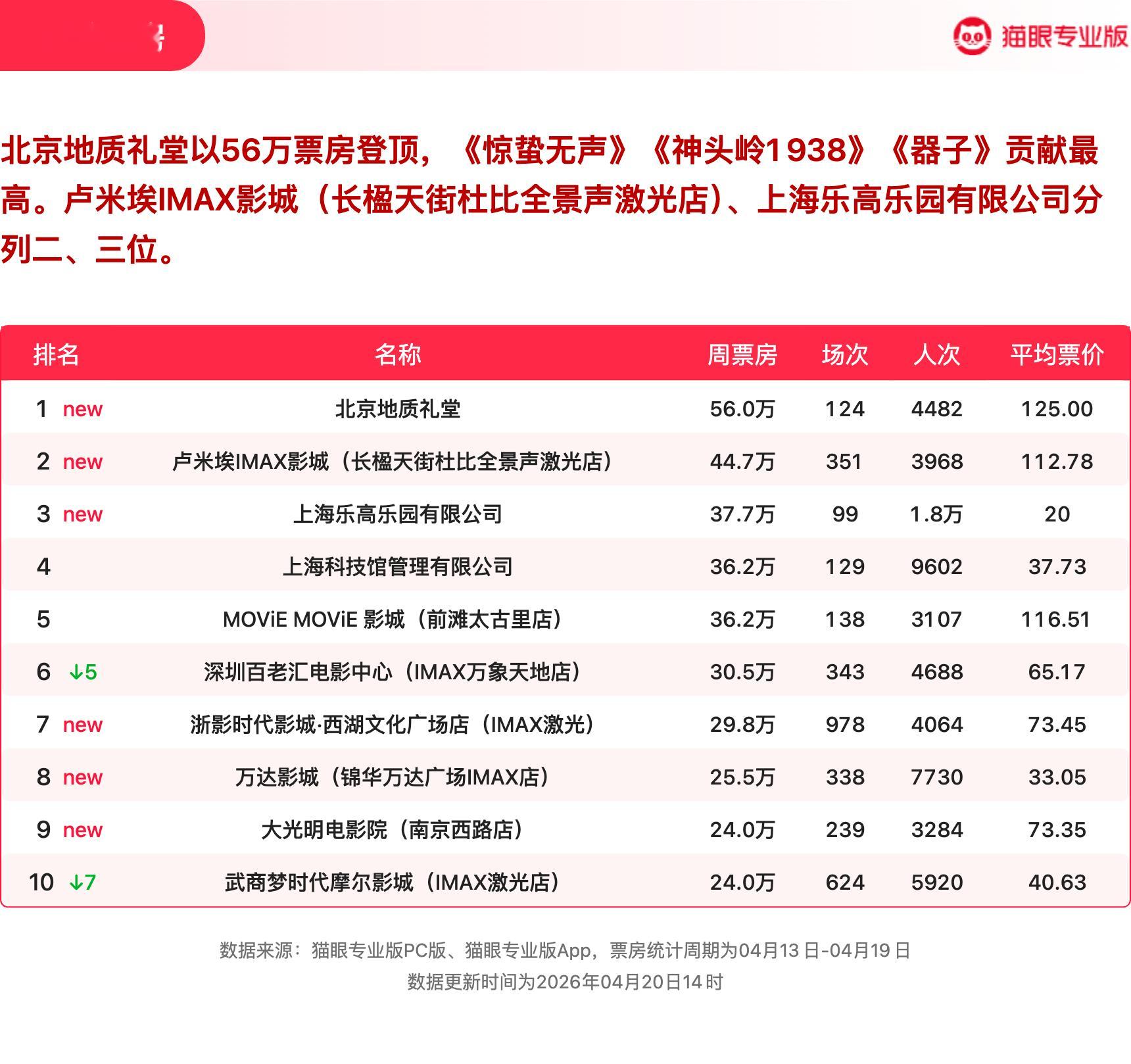 我许可蝉联票房周冠 猫眼专业版2026年第15周电影周报发布📒:周票房1.8