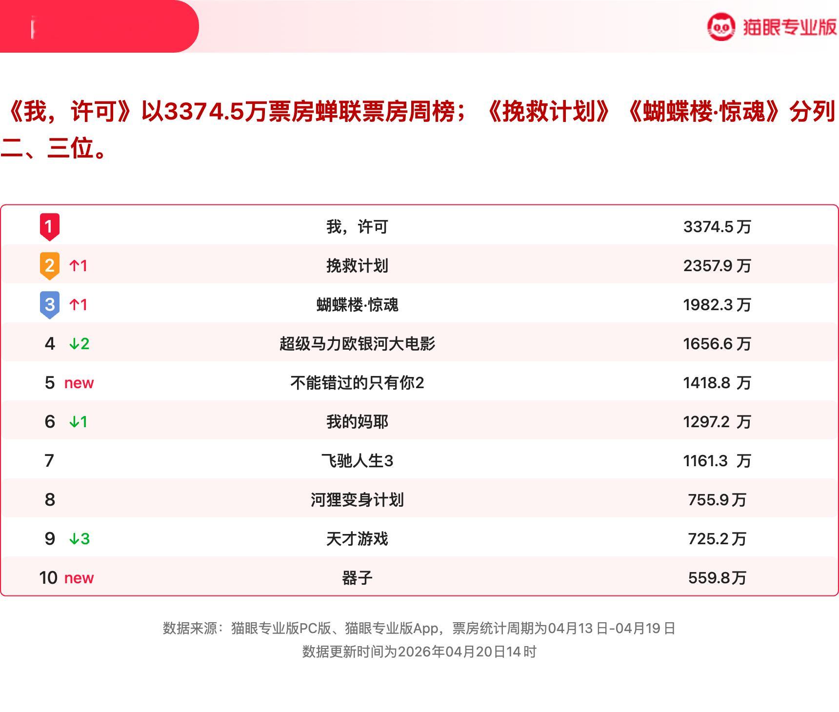 我许可蝉联票房周冠 猫眼专业版2026年第15周电影周报发布📒:周票房1.80亿,《我,许可》获票房周冠🏆,《挽救计划》《蝴蝶楼·惊魂》分列二三位。猫眼电影行业周报