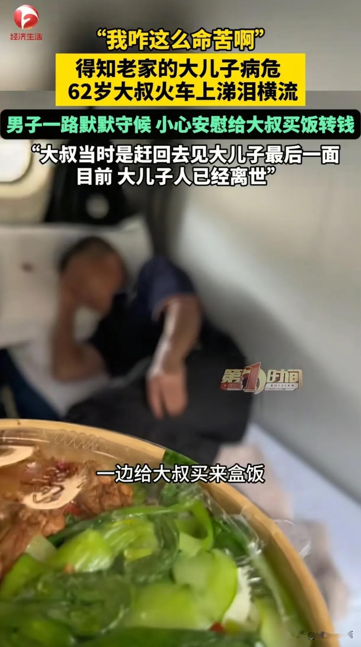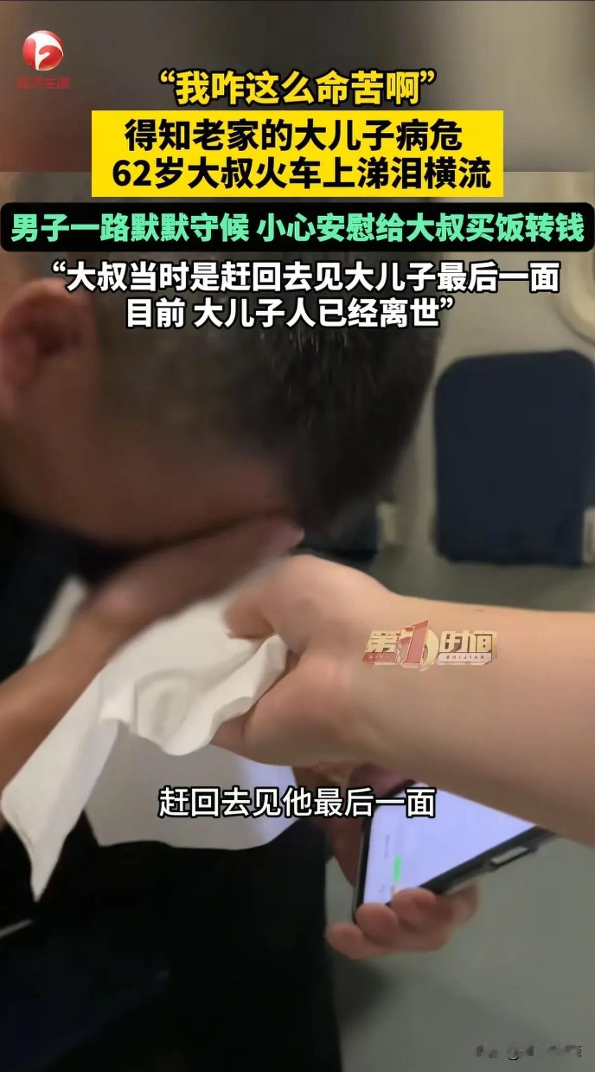 看哭了。火车上,一位62岁大叔接到中年儿子病危的消息,忍不住失声痛哭:“我咋这么