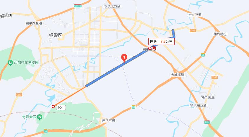 我在百度地图上测量了一下,这条主干道的长度近8公里,的确是非常笔直,一个小湾都没有。也只有在铜梁这样的丘陵地带,能修出这样笔直的公路了。