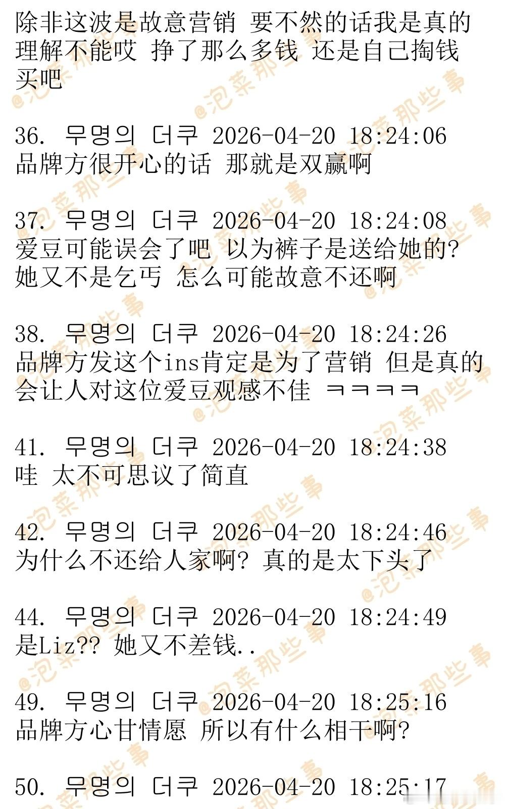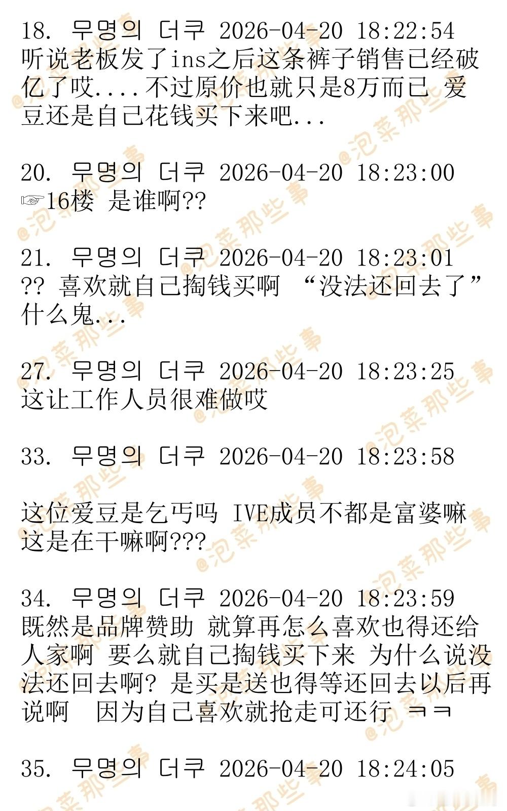 🔥🔥韩网1000楼热帖评论翻译🔥🔥IVE Liz不归还赞助服装引发争议韩网原帖帖主称:这是instiz论坛那边的热帖 某购物网站赞助了某位爱豆一条裤子 然后品牌方收到了爱豆身边工作人员发来的kakaotalk信息:因为爱豆非常喜欢这条裤子 所以就不还给品牌方了 评论区的反应两极分化 因为这样更有宣传效果 网站老板肯定也很开心 所以是双赢 vs 还是应该先把裤子还给品牌方 然后再请求品牌方送给自己当礼物 +)更新:据说这位爱豆是IVE Liz  cr.theqoo