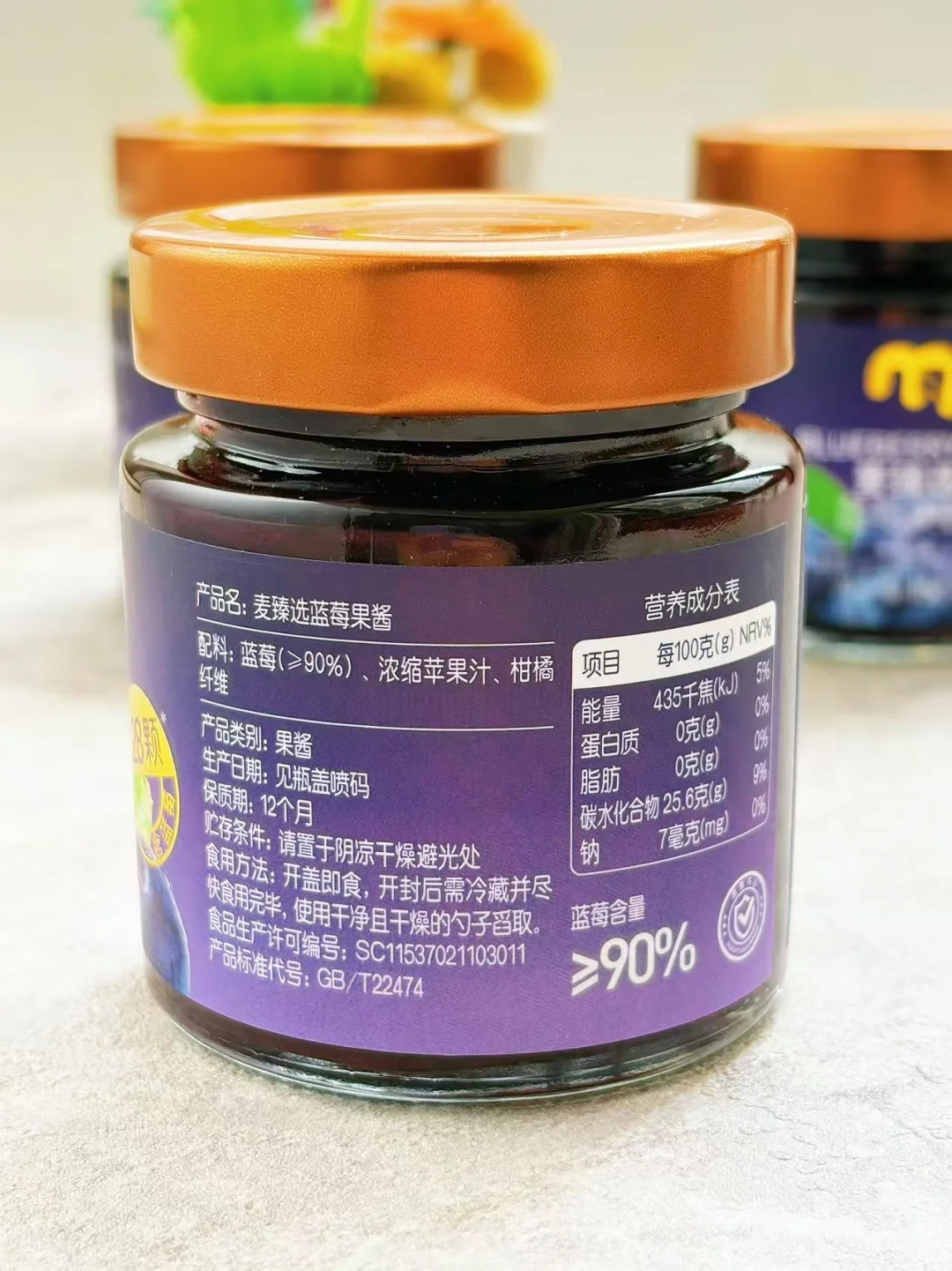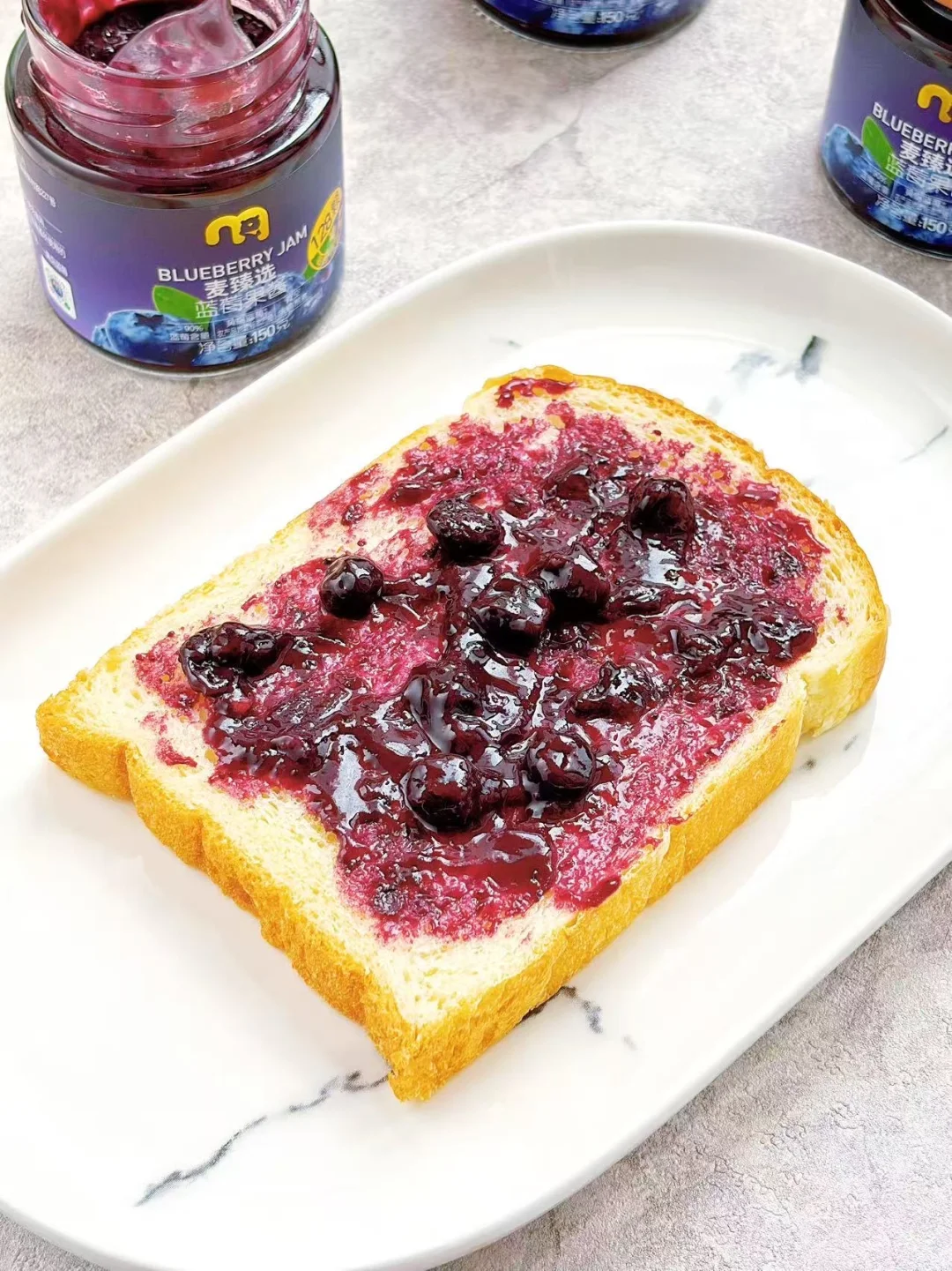 原味吐司片抹上麦德龙自有品牌麦臻选蓝莓果酱,蓝莓含量≥90%,配料表干净,没有额外添加蔗糖、防腐剂、香精、色素,健康无负担。每瓶用128颗黄岛蓝莓,真材实料,肉眼可见大颗果肉,纯纯的蓝莓鲜果本味,酸甜浓郁,一下子就把胃口打开了。
