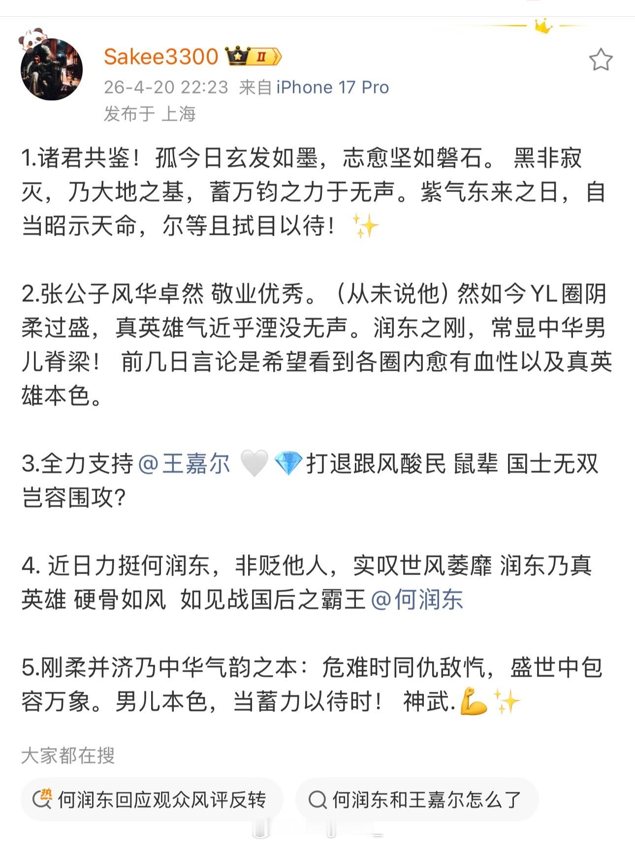 近日力挺何润东,非贬他人!