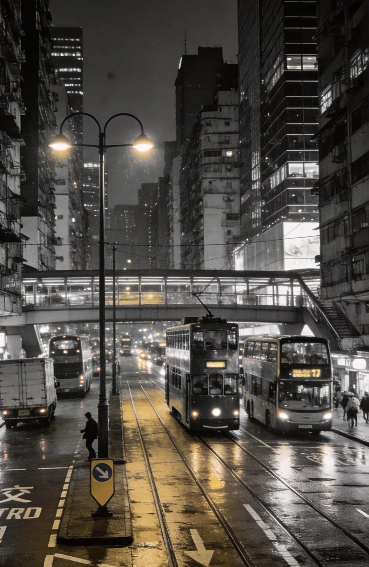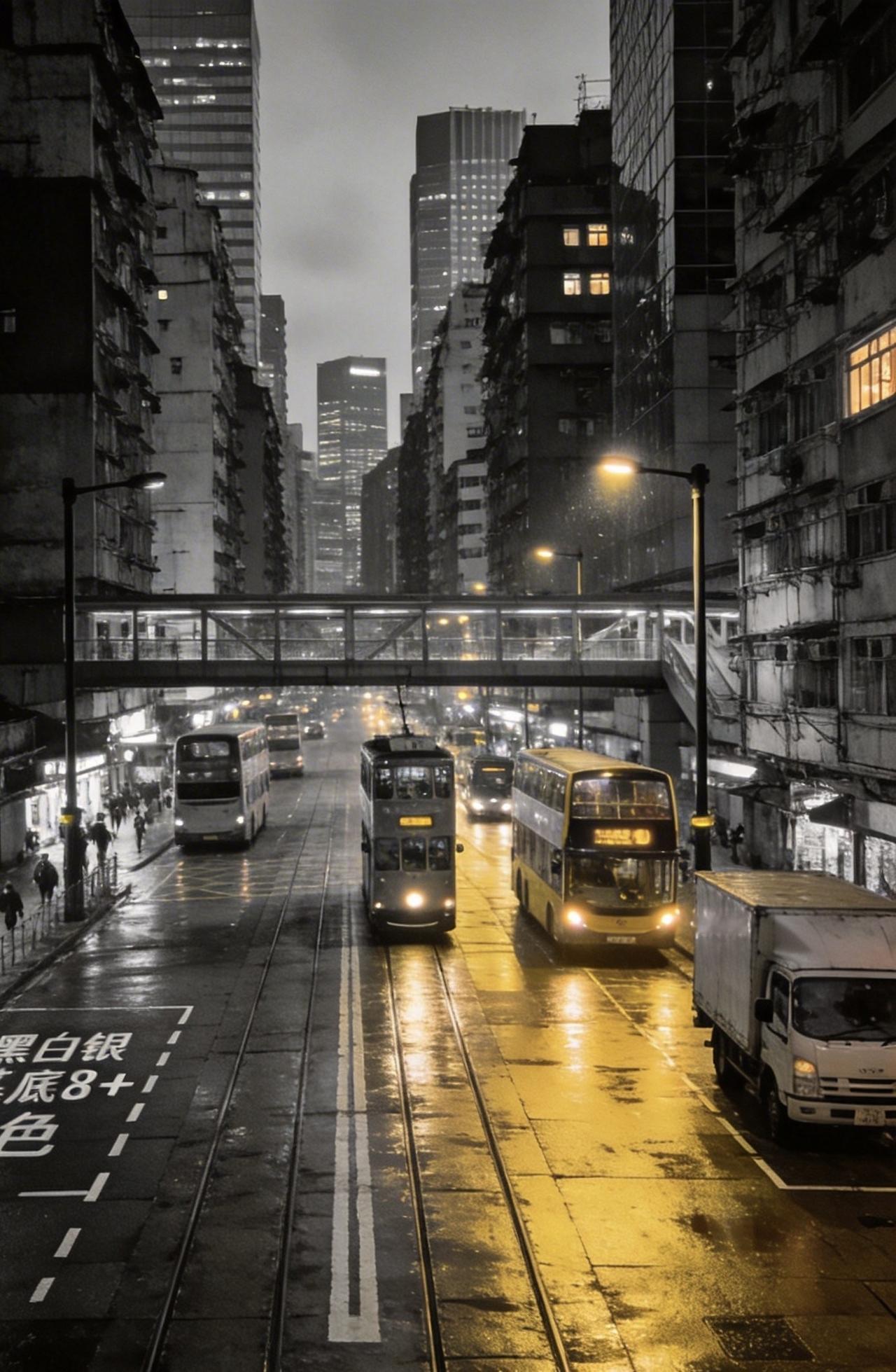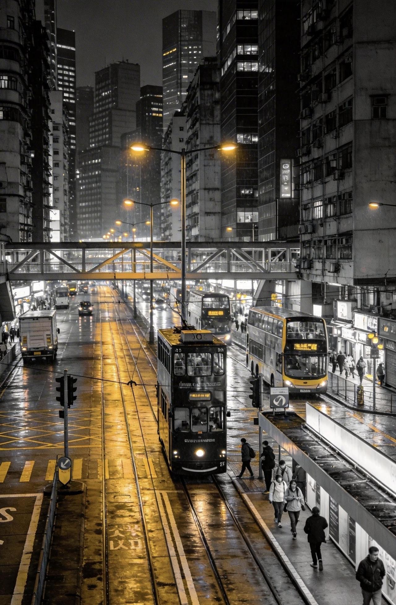 📝用徕卡Q3的28mm镜头,在雨夜后的都市夜街捕捉瞬间。老旧居民楼与现代写字楼挤在两侧,电车轨道、双层巴士与行人穿梭其间,过街天桥横架上空。湿润地面映着路灯暖光,车灯在暗部拉出亮线。