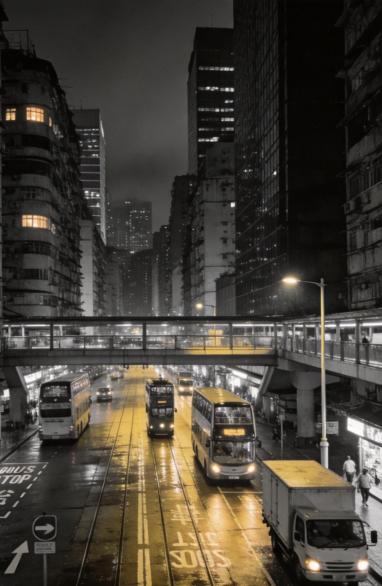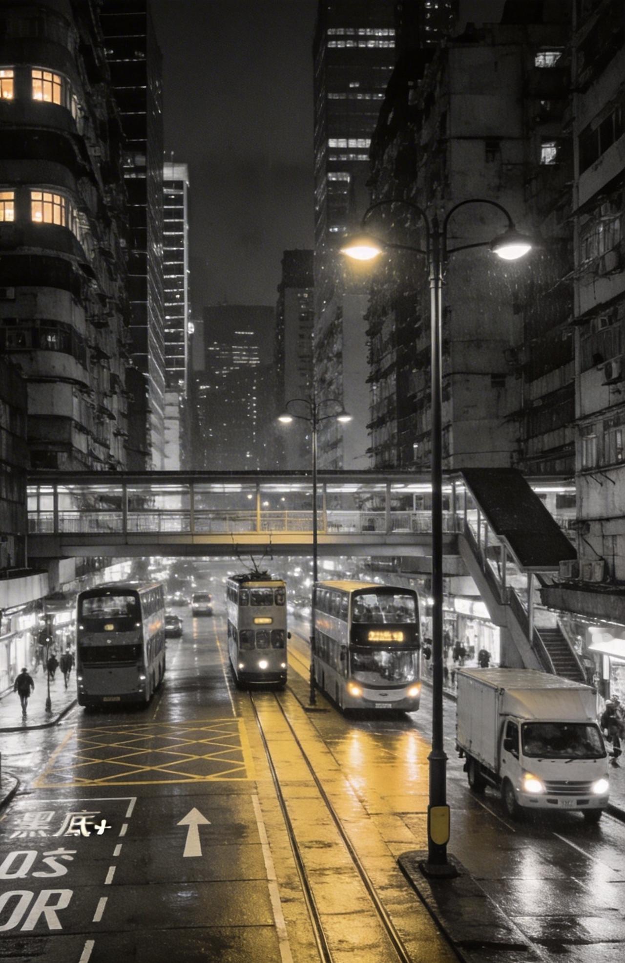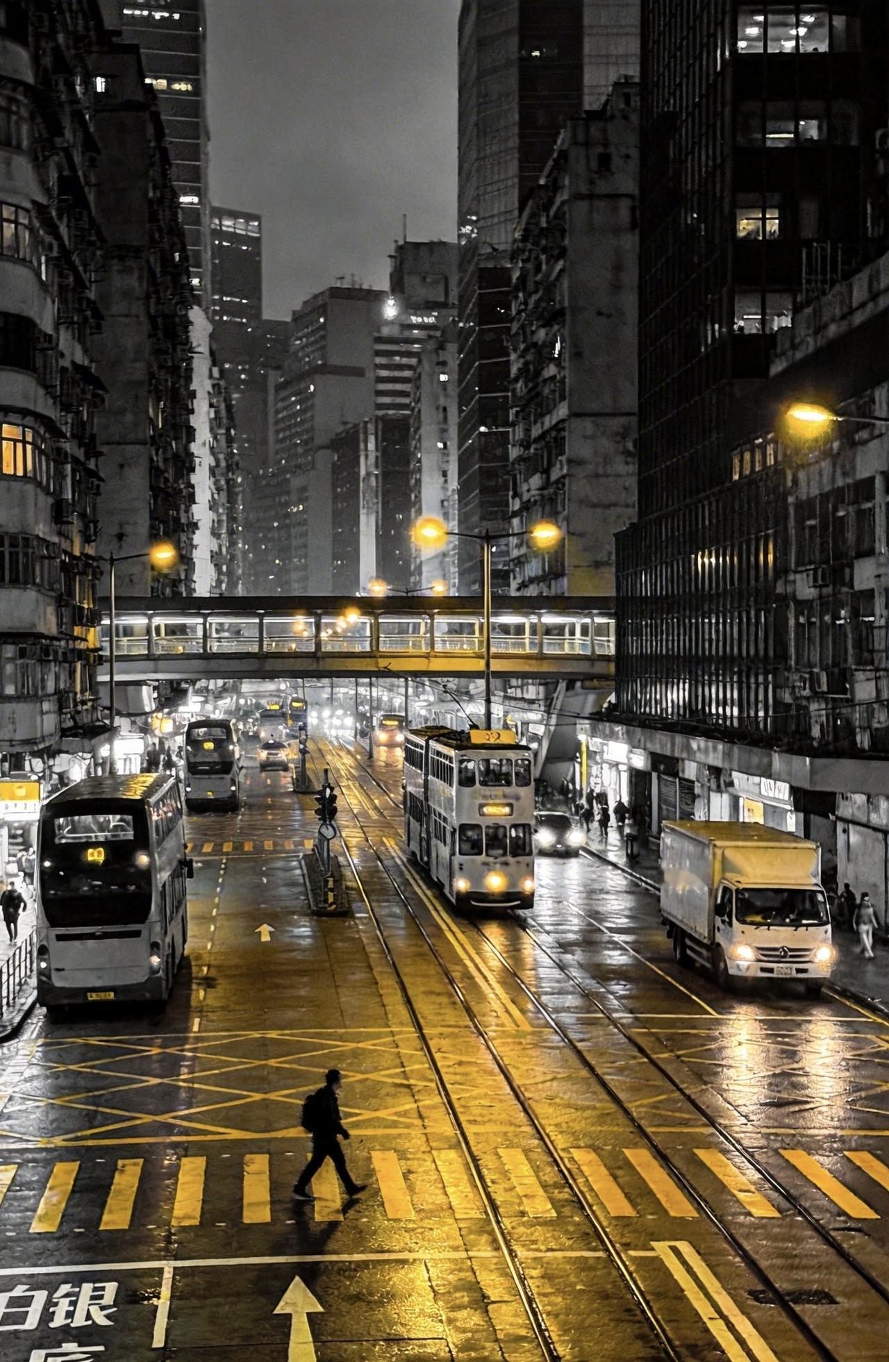 📝用徕卡Q3的28mm镜头,在雨夜后的都市夜街捕捉瞬间。老旧居民楼与现代写字楼挤在两侧,电车轨道、双层巴士与行人穿梭其间,过街天桥横架上空。湿润地面映着路灯暖光,车灯在暗部拉出亮线。