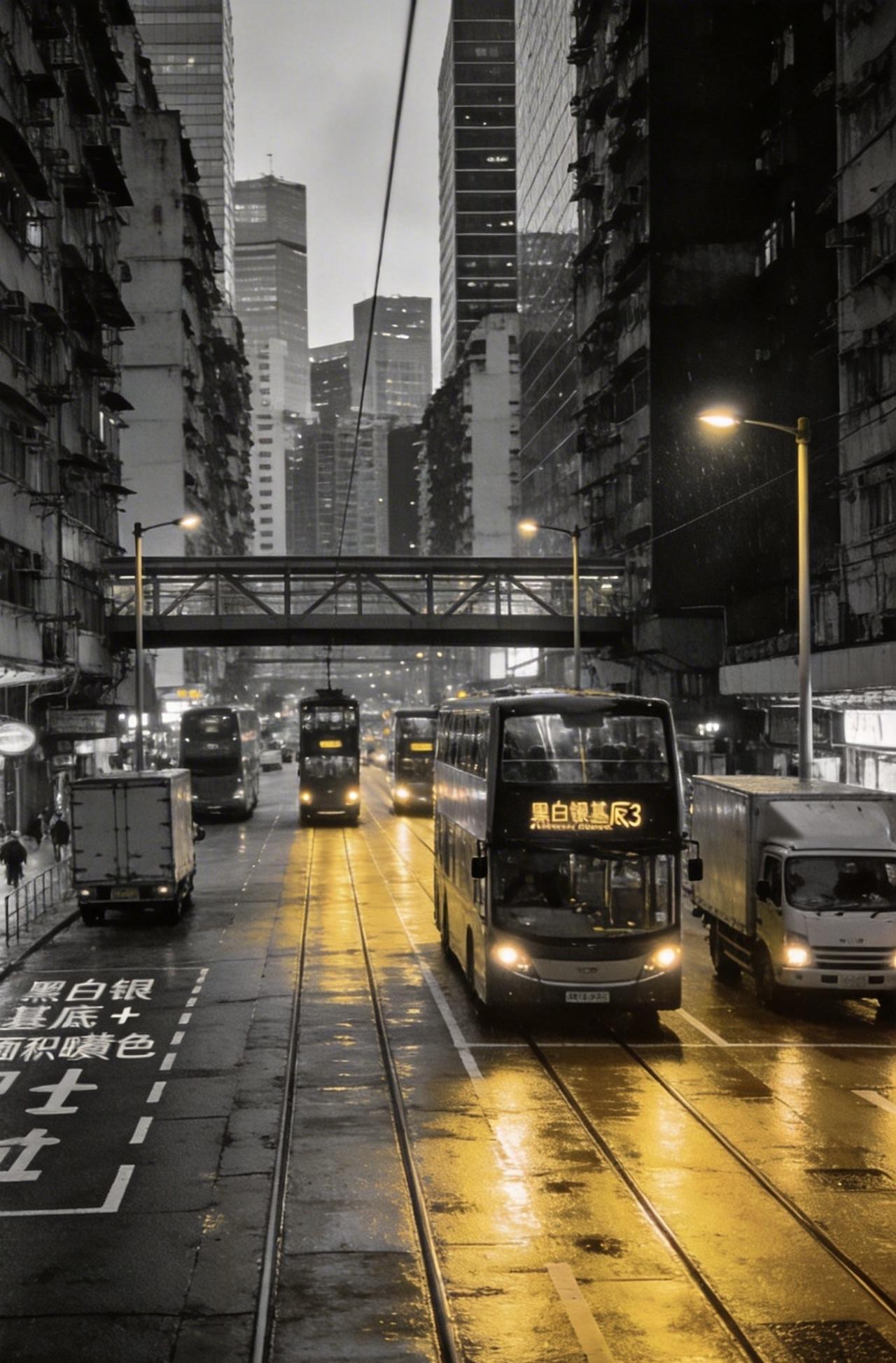 画面以黑白银打底,冷峻勾勒城市骨架,唯有灯光与反光化作暖黄,是唯一彩色。低饱和的德味黑白,加细腻胶片颗粒,暗角柔和。焦点锐利却带着时光凝固的空灵,暖黄撞色里,是繁华背后忧郁又诗意的生活气息。