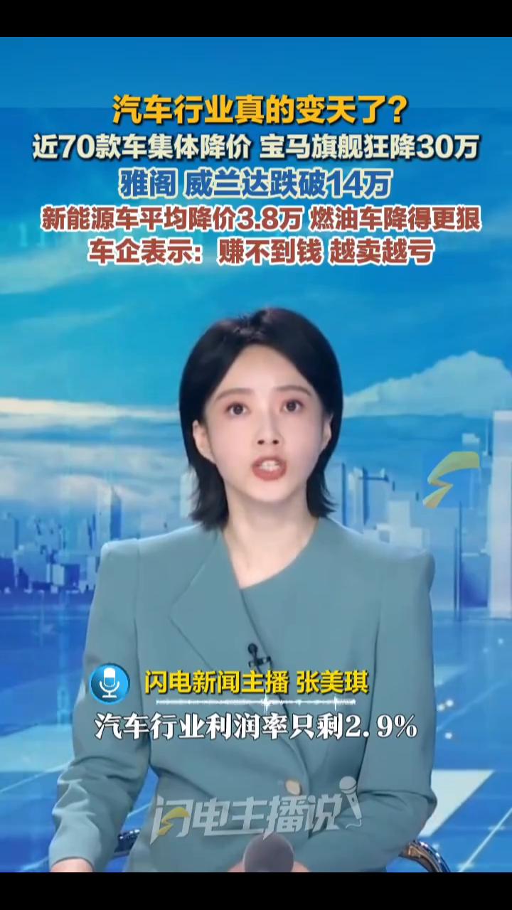 汽车行业真的变天了?近70款车集体降价,宝马旗舰狂降30万,雅阁、威兰达跌破14万,新能源车平均降价3.8万,燃油车降得更狠。车企表示:赚不到钱,越卖越亏。