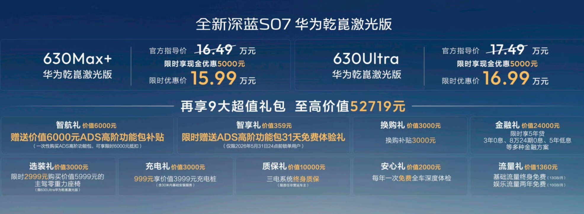 全新深蓝S07华为亁崑激光版上市,限时优惠价15.99万起,还有9大礼包?这配置