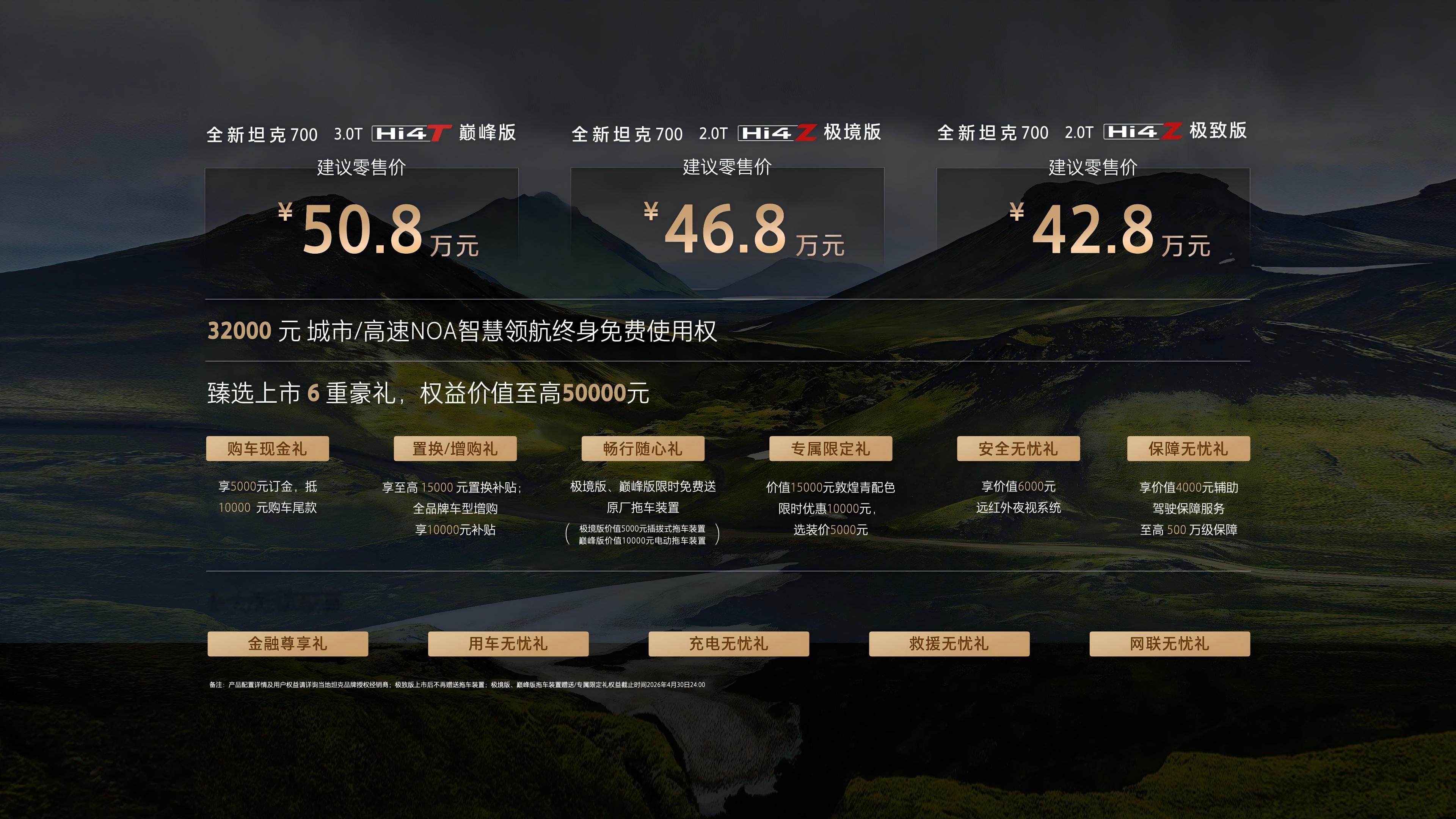 全新坦克700正式上市了,42.8万起,这台车别的先不说,就这个颜值就杠杠顶,完美融合了东方美学和机械艺术,在技术和配置方面坦克700更是全方位的强,长城几乎各方面技术都是第一梯队,其它同级SUV只是SUV,坦克700同时还是硬派越野车,这种一车多能非常有吸引力!发布会上坦克品牌还重磅发布高端社交平台“麒麟荟”,为车主提供高端社交平台,首批开放马术、海钓、摄影、商业等兴趣圈层。全新坦克700新时代新旗舰麒麟云中现境启新人生