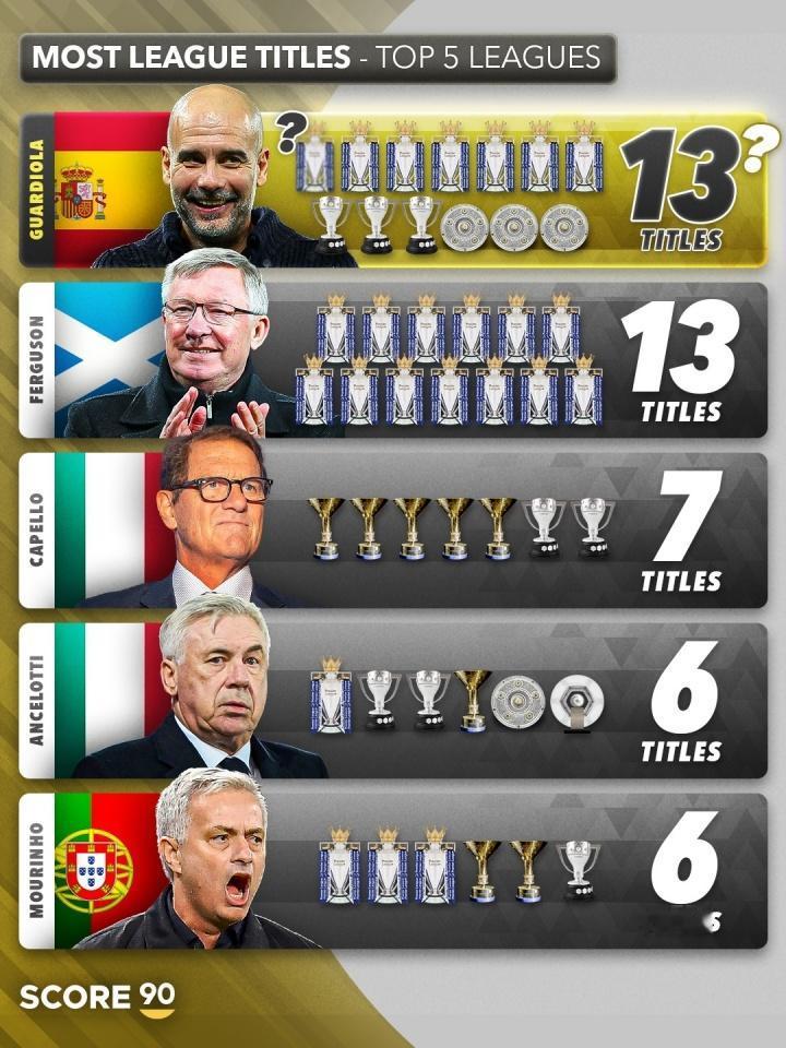 两人可谓是断崖式的领先,卡佩罗以7个五大联赛冠军成为第三名,随后是安切洛蒂和穆里尼奥的6座!