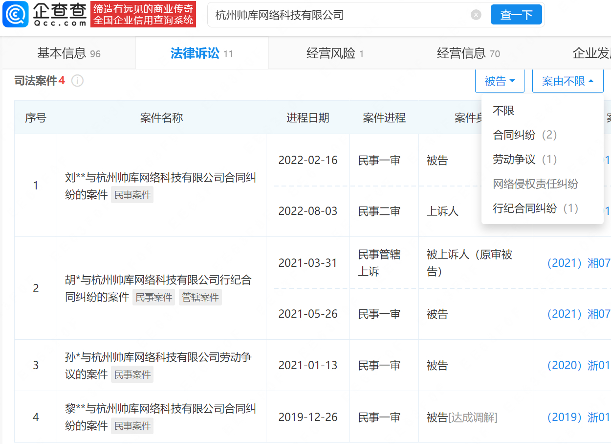 企查查APP显示,涉事主播所属的杭州帅库MCN关联公司为杭州帅库网络科技有限公司,该公司成立于2015年6月,注册资本为115万余元,经营范围包含演出经纪业务、计算机技术研发、服装、服饰的设计、研发等,由福建网龙计算机网络信息技术有限公司、林崇标等共同持股。对外投资信息显示,该公司已成立多家传媒公司,还涉足电商、体育、餐饮等领域;法律诉讼显示,该公司涉多起司法纠纷,案由包括合同纠纷、行纪合同纠纷、劳动争议。