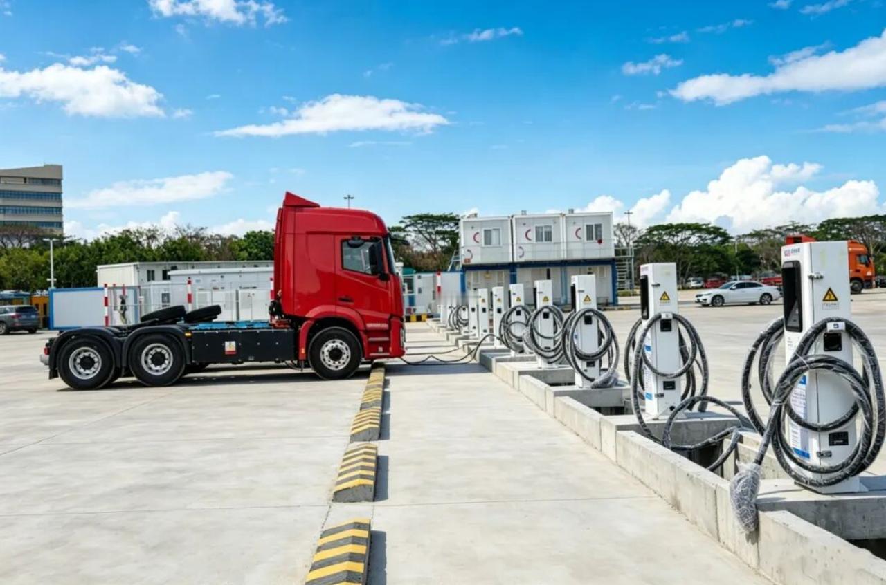 作为龙穴岛首个集卡充电项目,该项目集停车、能源、维修、生活服务于一体。可同时满足30台重卡充换能需求,单日服务能力达500车次以上。