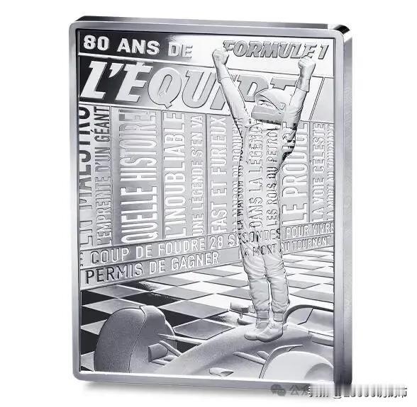 赛车银币正面定格了一名F1赛车手庆祝胜利的英姿。背景为《队报》历史上有关F1赛车的经典头版,同时在币面雕铸“《队报》80周年”“F1赛车”字样。