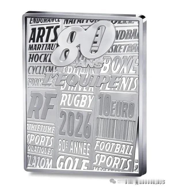 2026年,为庆祝《队报》创刊80周年,法国巴黎铸币局发行金银纪念币,借此向体育精神以及那些每日书写体育传奇的人们致敬。该套纪念币将体育激情与雕刻艺术完美融合,在方寸之间永恒定格了那些深刻影响了几代读者与球迷的感人瞬间、体育项目与人物。