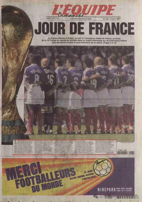 谈及《队报》的故事之前,首先要追溯其更为显赫的前身——《汽车报》。1900年,为了在激烈的报纸销量大战中击败竞争对手,主编德斯格朗吉构想出了一个惊世骇俗的点子:组织一场最伟大的自行车赛事。1903年,环法自行车赛横空出世,那个穿着黄色领骑衫的车手形象,从此刻进了报纸的基因里。然而,历史总是伴随着阵痛。第二次世界大战期间,《汽车报》因立场争议而被取缔。1946年,在战后重建的萧瑟中,《汽车报》在主编兼体育记者雅克·戈代的带领下,以《队报》之名重生,并将目光投向了更为广阔的体育世界。它虽未继承那一抹标志性的黄色纸张,但环法荣耀的延续,仍是它永不磨灭的胎记。图2:《队报》头版报道1998年法国队首次捧起大力神杯