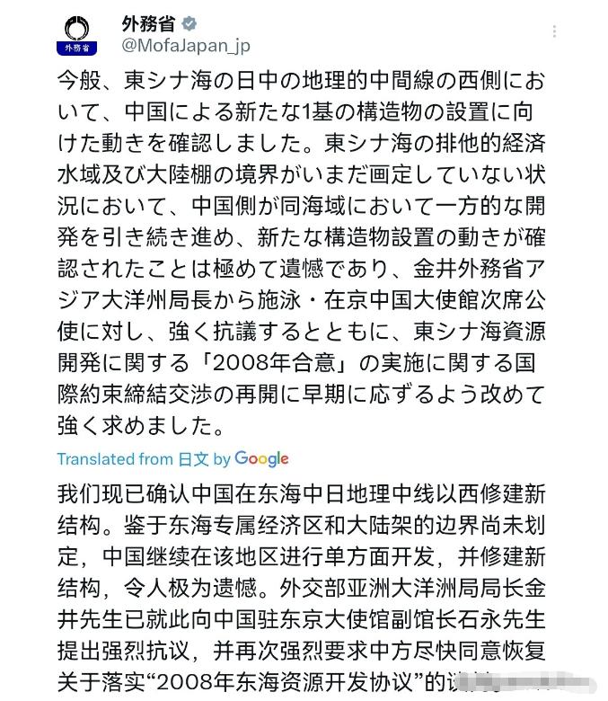 这次轮到日本强烈不满和抗议了!日本要求跟我们启动谈判,我们不予理会!4月20日,日本外务省表示,日方确认中方在东海“日中地理中间线”西侧,正推进新建一座设施的相关作业。在东海专属经济区及大陆架界限尚未划定的情况下,中方持续在该海域单方面推进开发,且此次又被确认有新建设施的动向,日方对此深表遗憾。