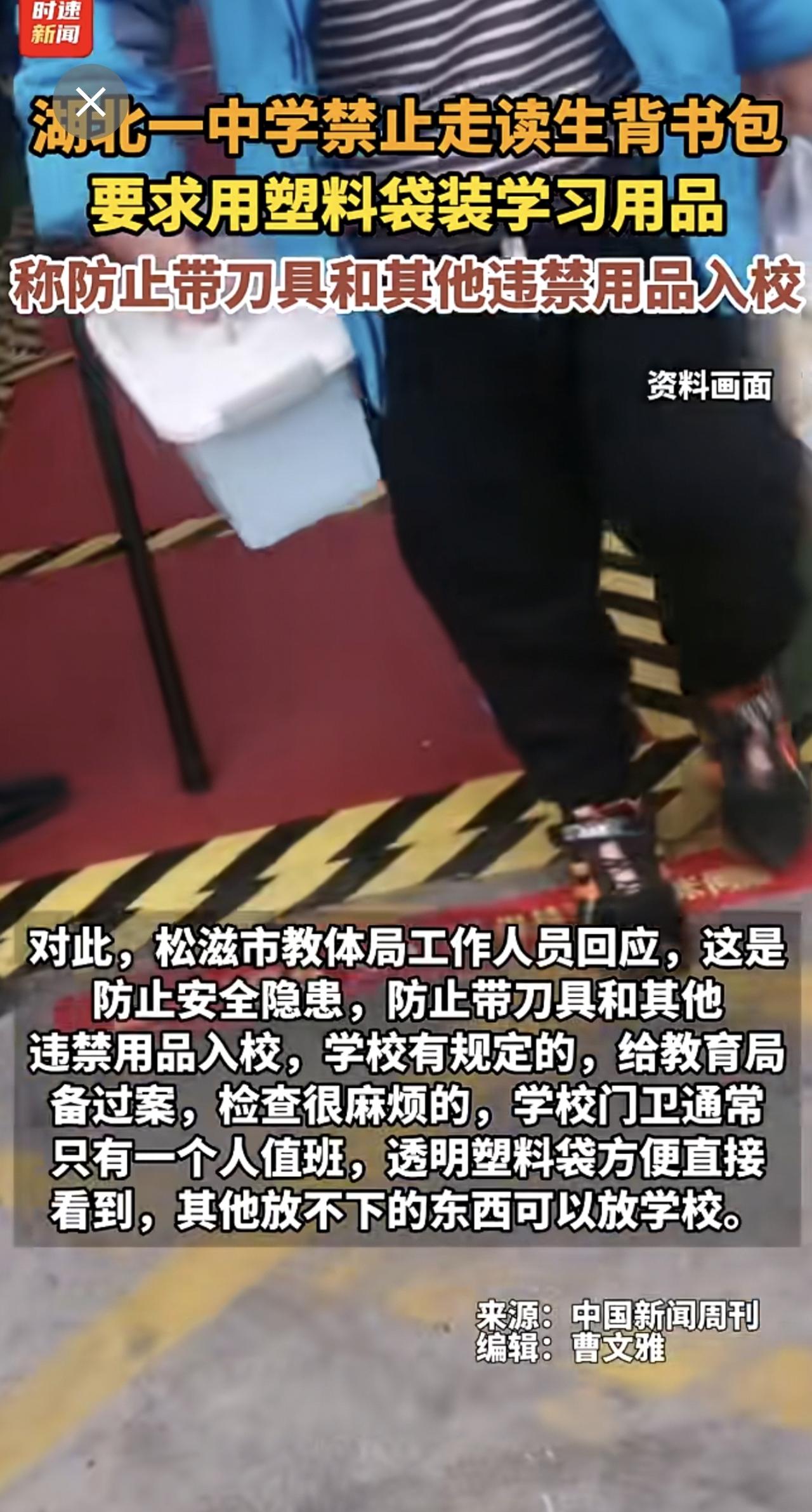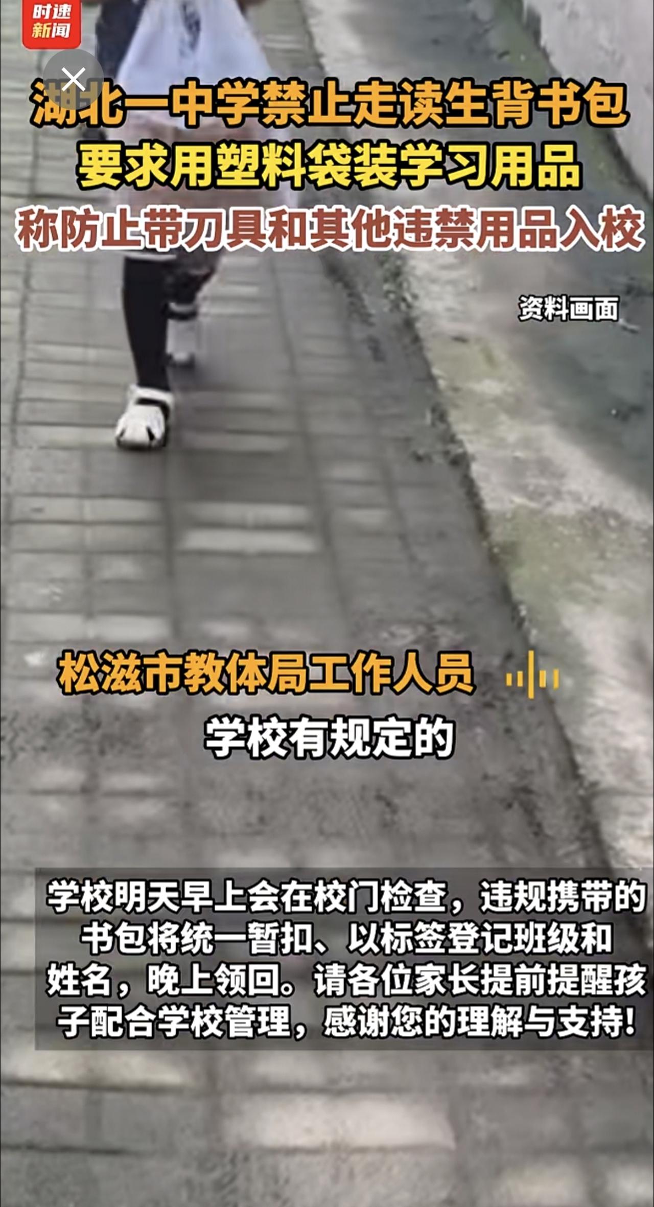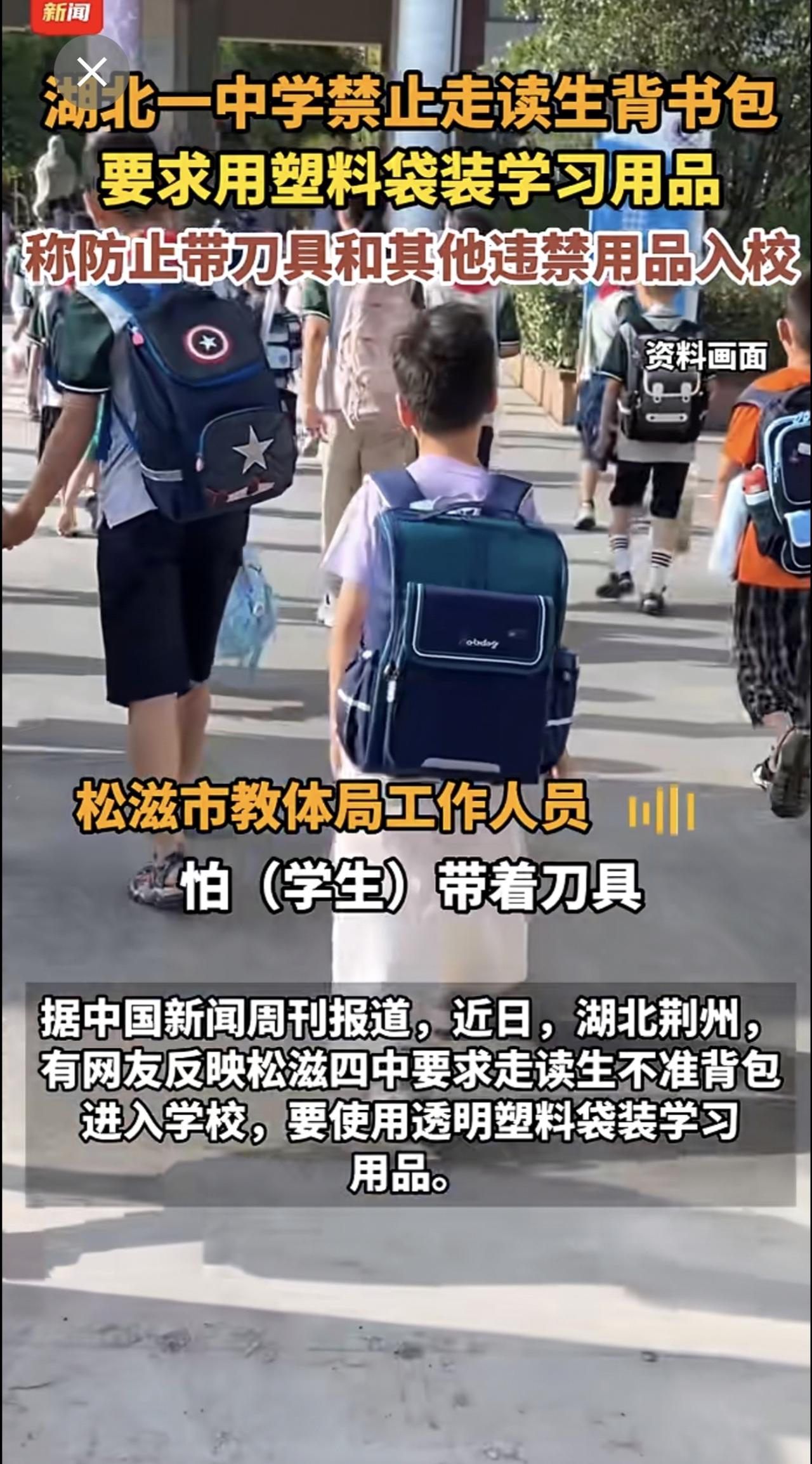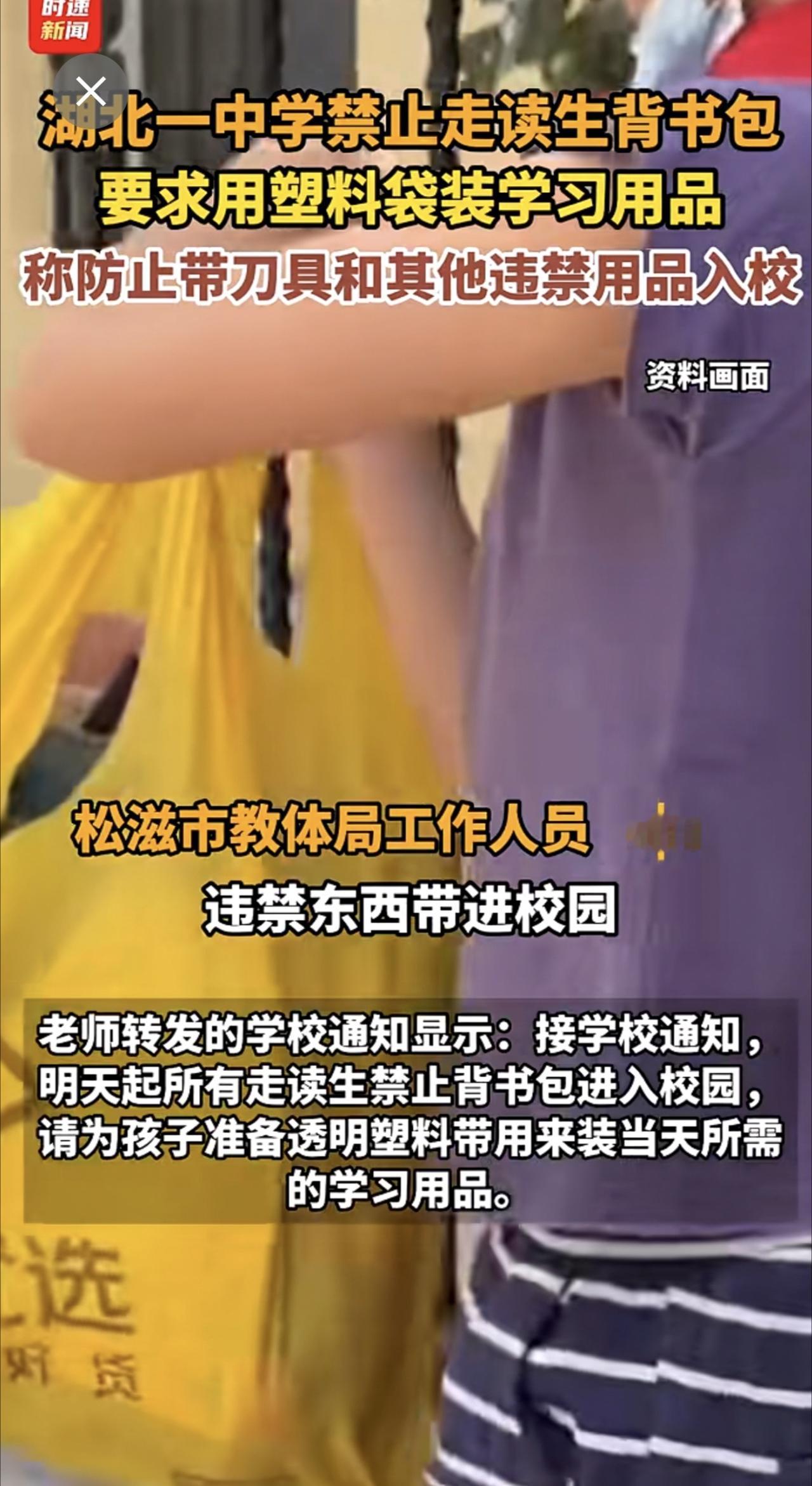 湖北一中学禁止走读生背书包,要求用塑料袋装学习用品,称防止带刀具和其他违禁用品入