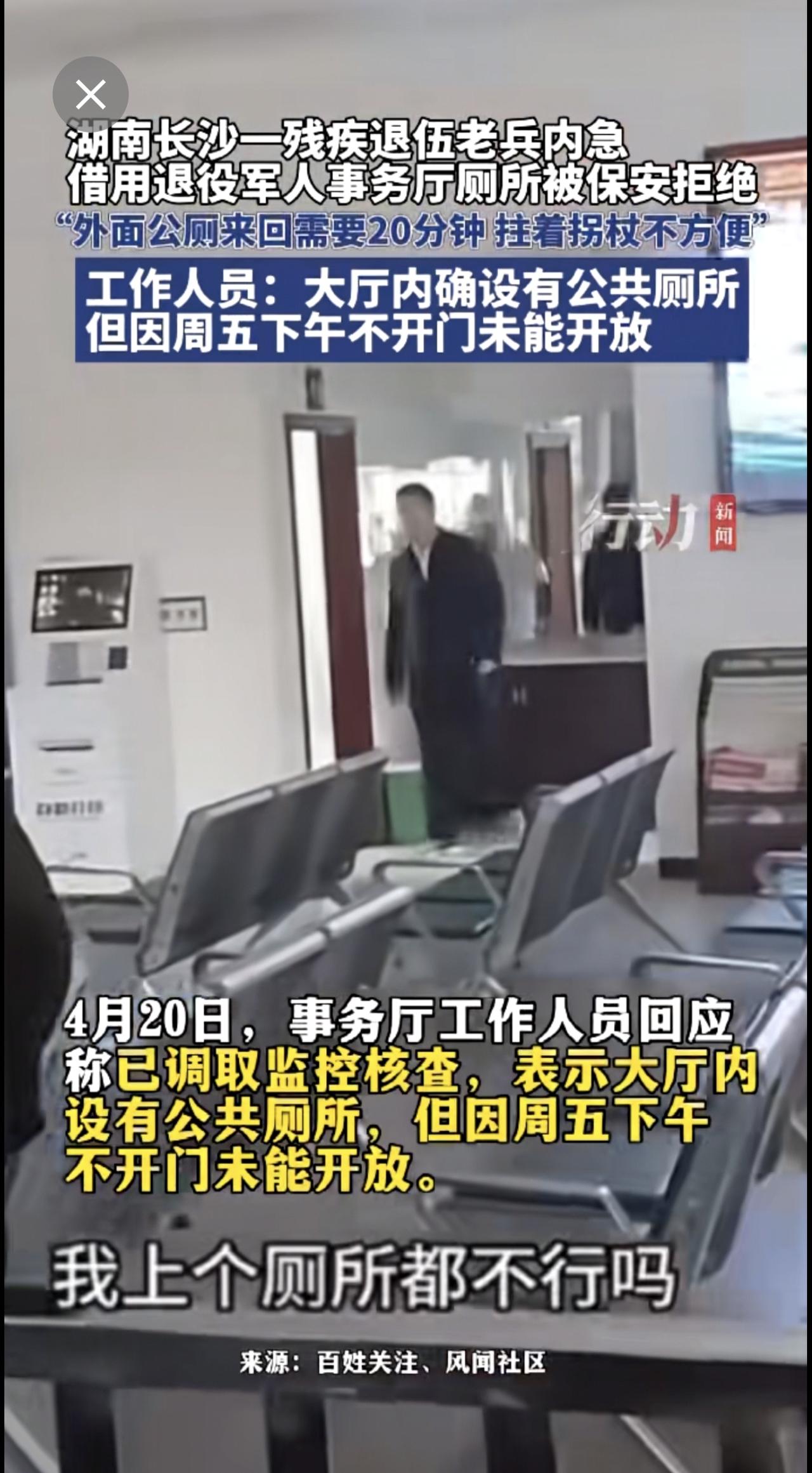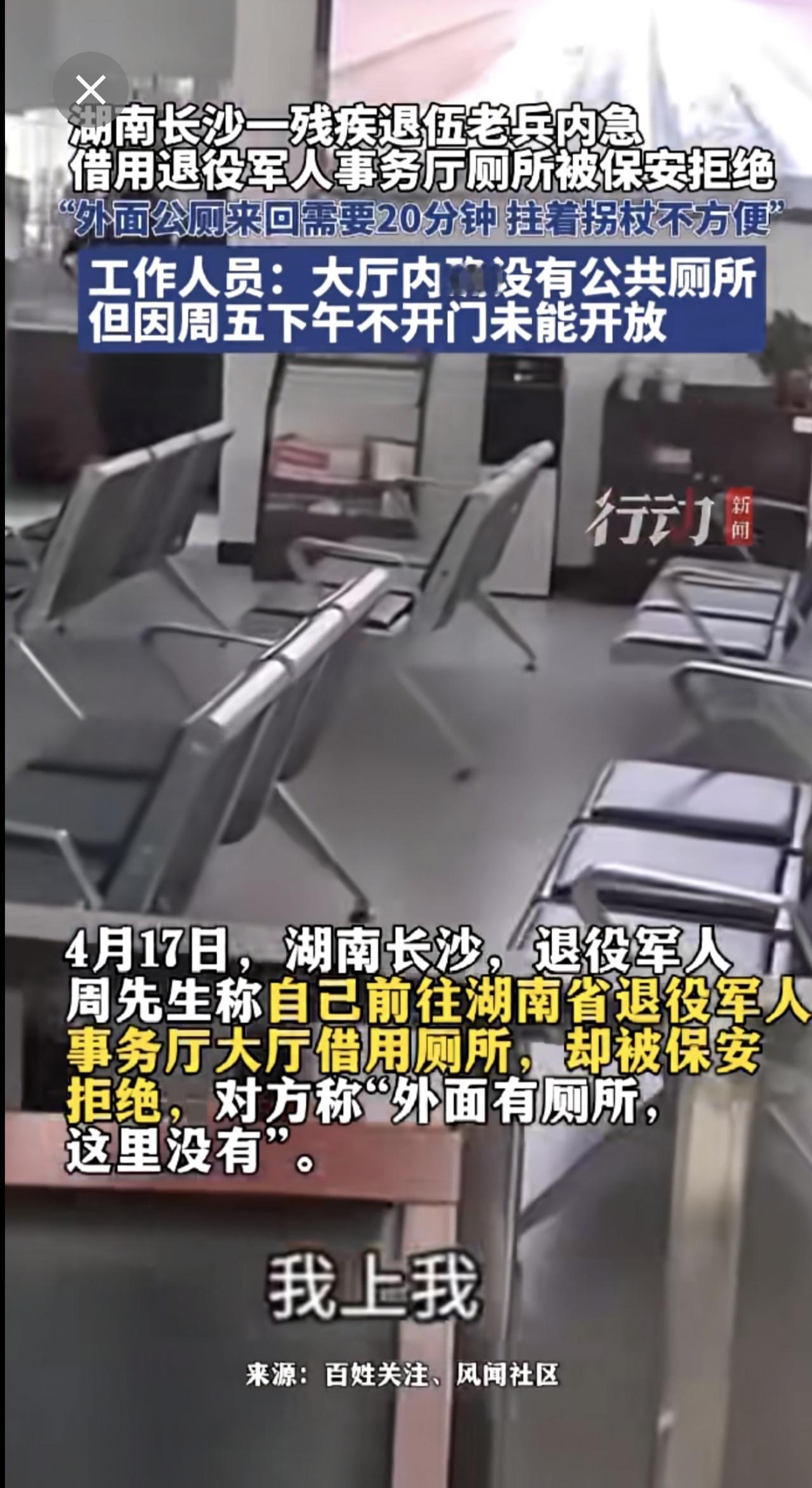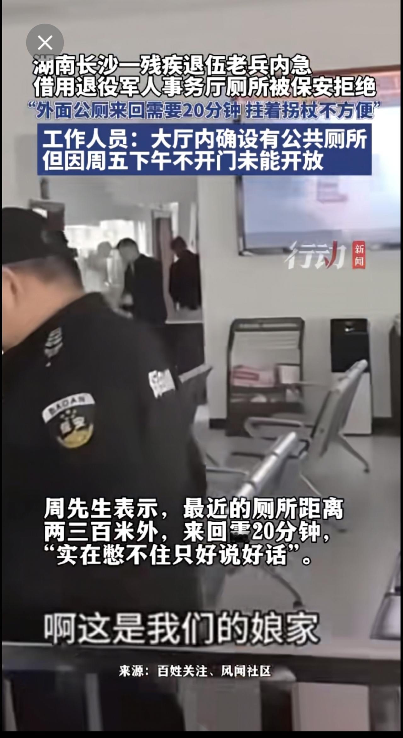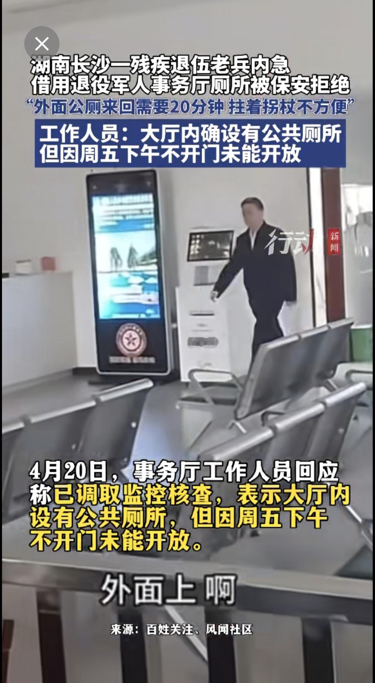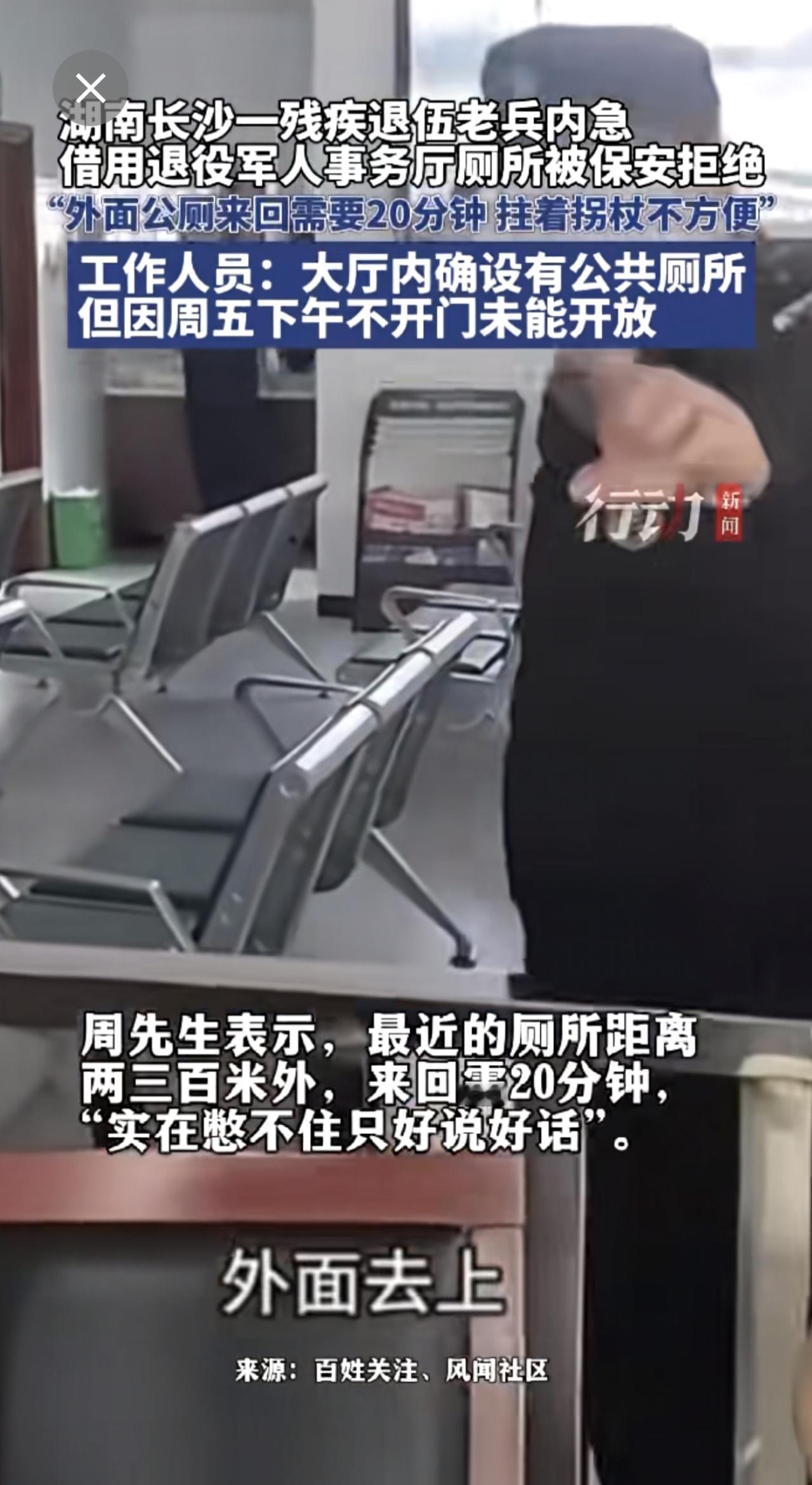 湖南长沙一残疾退伍老兵内急借用退役军人事务厅厕所被保安拒绝,“外面公厕来回需要20分钟 拄着拐杖不方便”,工作人员:大厅确设有公共厕所,但因周五下午不开门未能开放