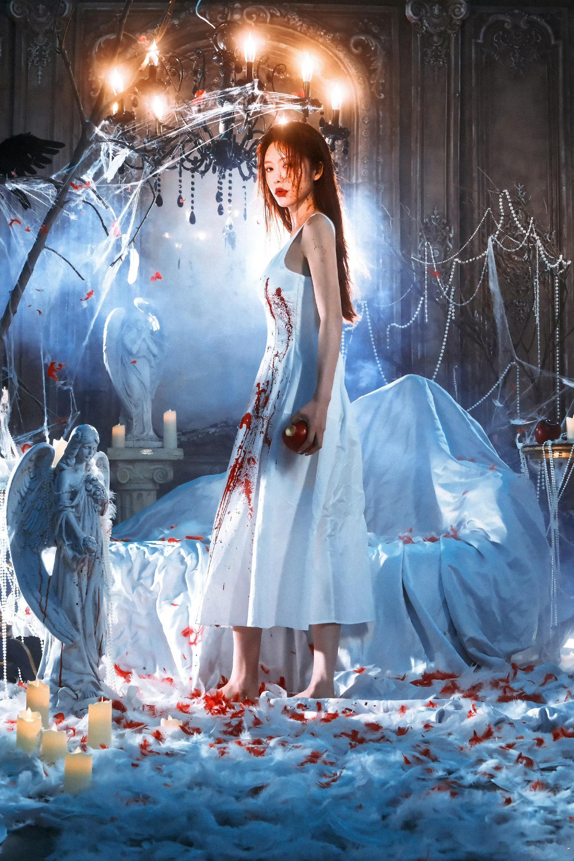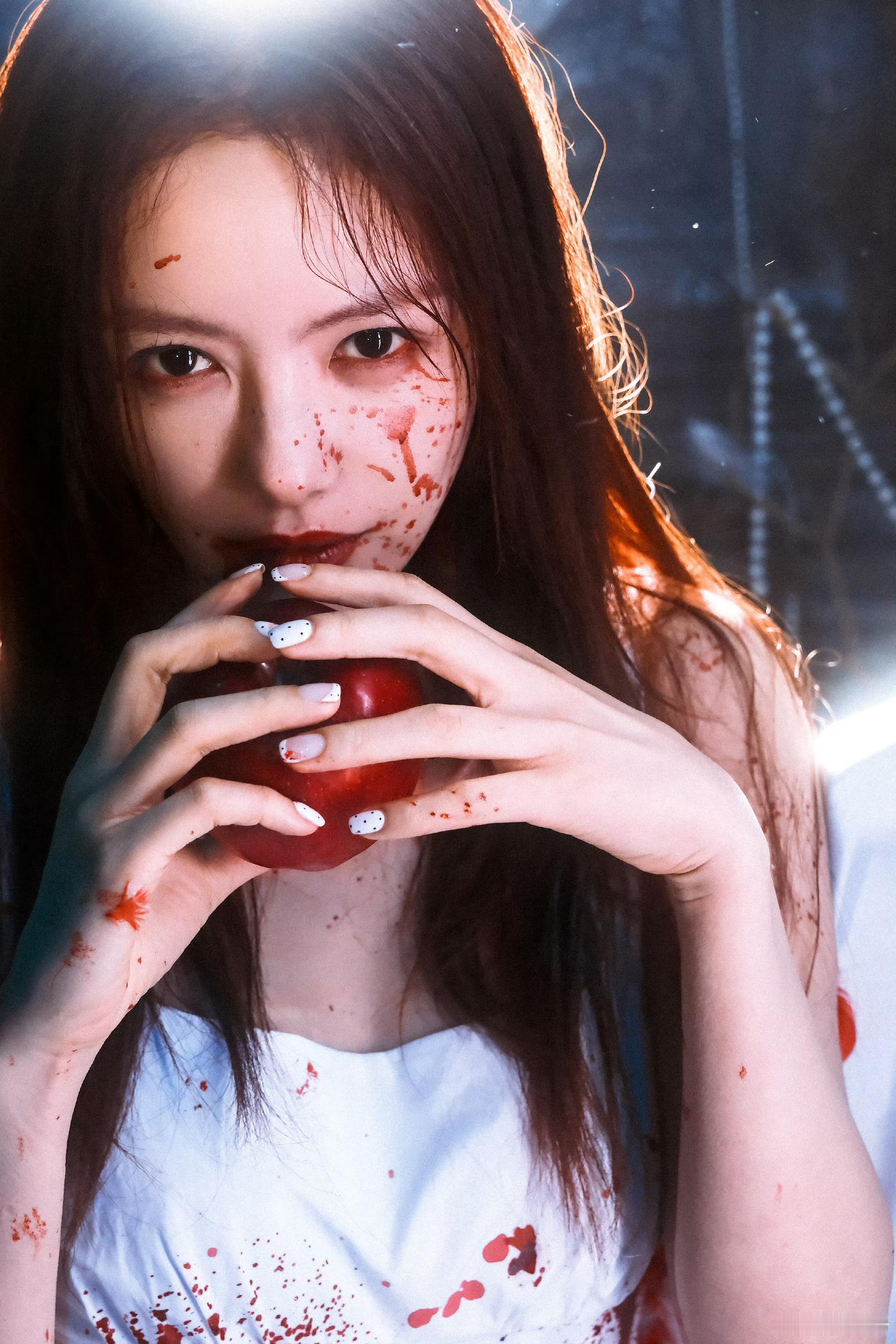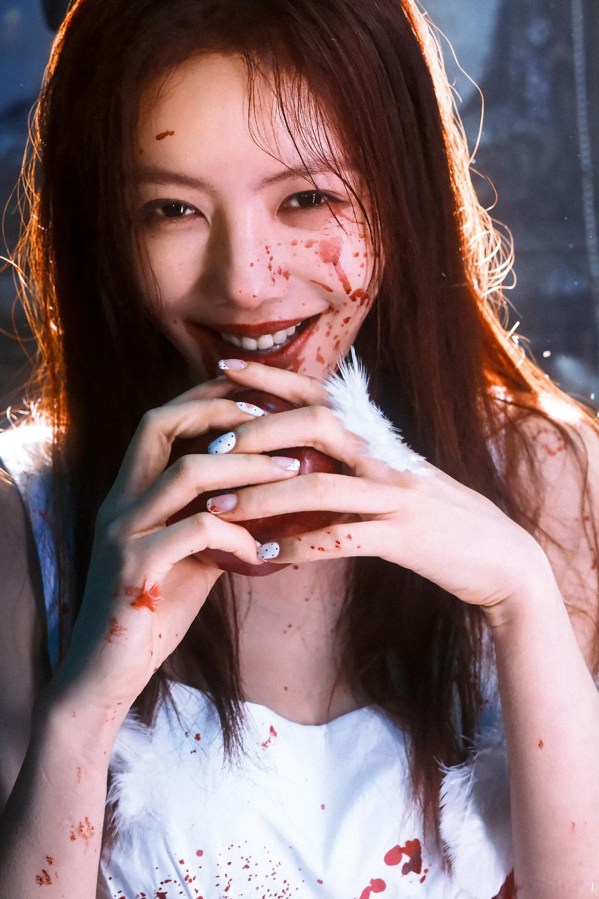蔡文静疯批恶女感白裙染血,眼神带刀。这组写真简直是从无限流里走出来的疯批BOSS