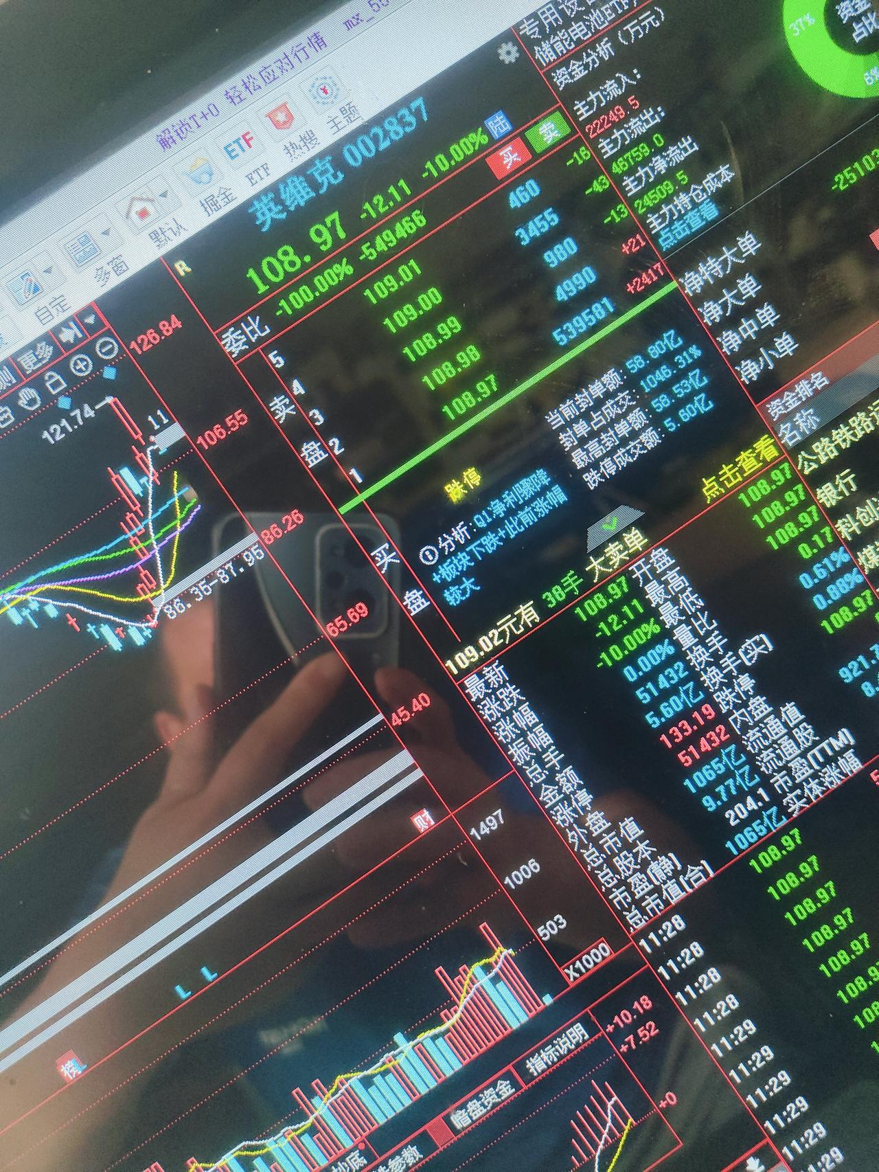 当前封单依旧还有53.95万手,封单金额58.80亿元,按照上午成交量5.6亿元,明天大概率是开不了板的。后天大概率还是开不了板,也就是108.97-10.89=98.08,98.08-9.80=88.28最低也要到88元附近。对于昨天121元追涨进来的人来说,损失太大了!88/121=0.7273,本金直接没了28%。