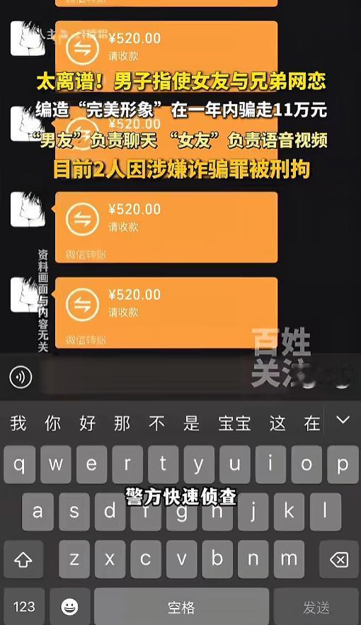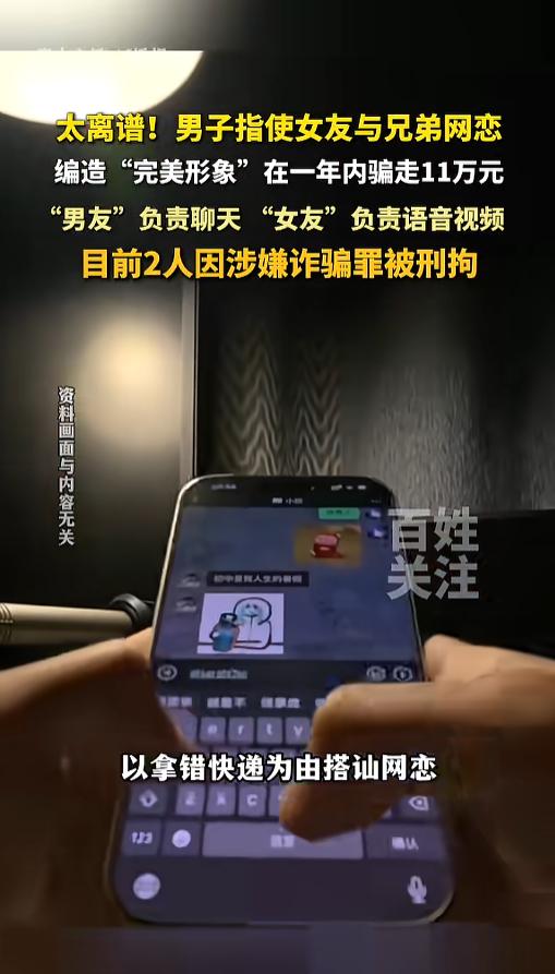 信息来源:《太离谱!男子指使女友与兄弟网恋,编造“完美形象”在一年内骗走11万元。》百姓关注