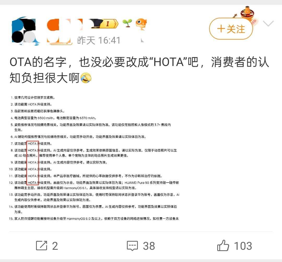 华为一直以来系统、软件、功能升级在描述上都是写“HOTA”,此前没人关注这个点,怎么昨天突然出现不少人在吐槽,找不到话题硬找话题