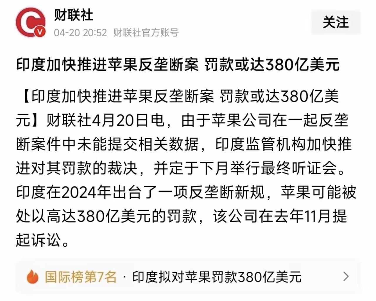 印度反垄断机构CCI这回是来真的。起因是2021年有印度初创企业投诉苹果强制开发者用自家支付系统、抽高额佣金,2024年印度直接出台新规,罚款不再按印度境内营业额算,而是按全球总营业额来罚。按这个算法,苹果最高可能被罚380亿美元,苹果去年赶紧去法院告状说这规矩“蛮不讲理、违宪”,但印度方面根本不吃这套,直接把最终听证会定在了今年5月21日。更头疼的是供应链那边也掉链子。去年富士康把派去印度培训工人的约300名中国大陆工程师撤了回来,本地工人培训跟不上,没有中国技术人员指导产线根本跑不顺。知情人士直言缺乏经验丰富的中国员工会大幅降低产线运营效率,苹果这趟印度行走得磕磕绊绊。