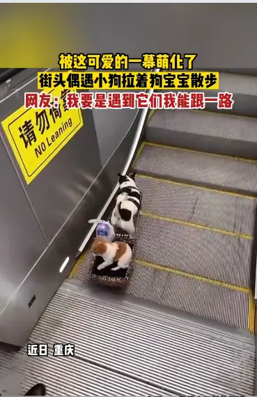 萌坏了,看这两个散步的“毛孩子”近日,重庆,一网友路遇一只小狗拉着狗宝宝溜达逛街,被这长幼俩毛孩子萌到了。从这位网友分享的画面中看到,年长的小狗兴冲冲地走在前面,身上拉着一辆很“拉风”的小板车,年幼的狗宝宝坐在板车上,在悠闲而调皮地玩耍。画面最后,这俩货竟然走向正在运转中的电梯,看板车前后的长度,让人很担心它们两个是否能安全通过电梯。网友纷纷跟帖关注和留言,其中很多透露出类似担心,也从另方面说明大都被这两只小狗狗萌到了:“上扶梯后面的不掉吗?”“这狗还会坐扶梯?”看这位网友,明显地羡慕嫉妒爱:“携带大件行李,及推婴儿车的旅客请勿乘坐自动扶梯”。