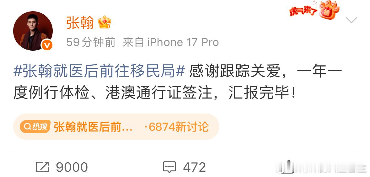 张翰回应去移民局 张瀚回应了,去的是出入境办理大厅,办的是港澳通行证签注,体检是
