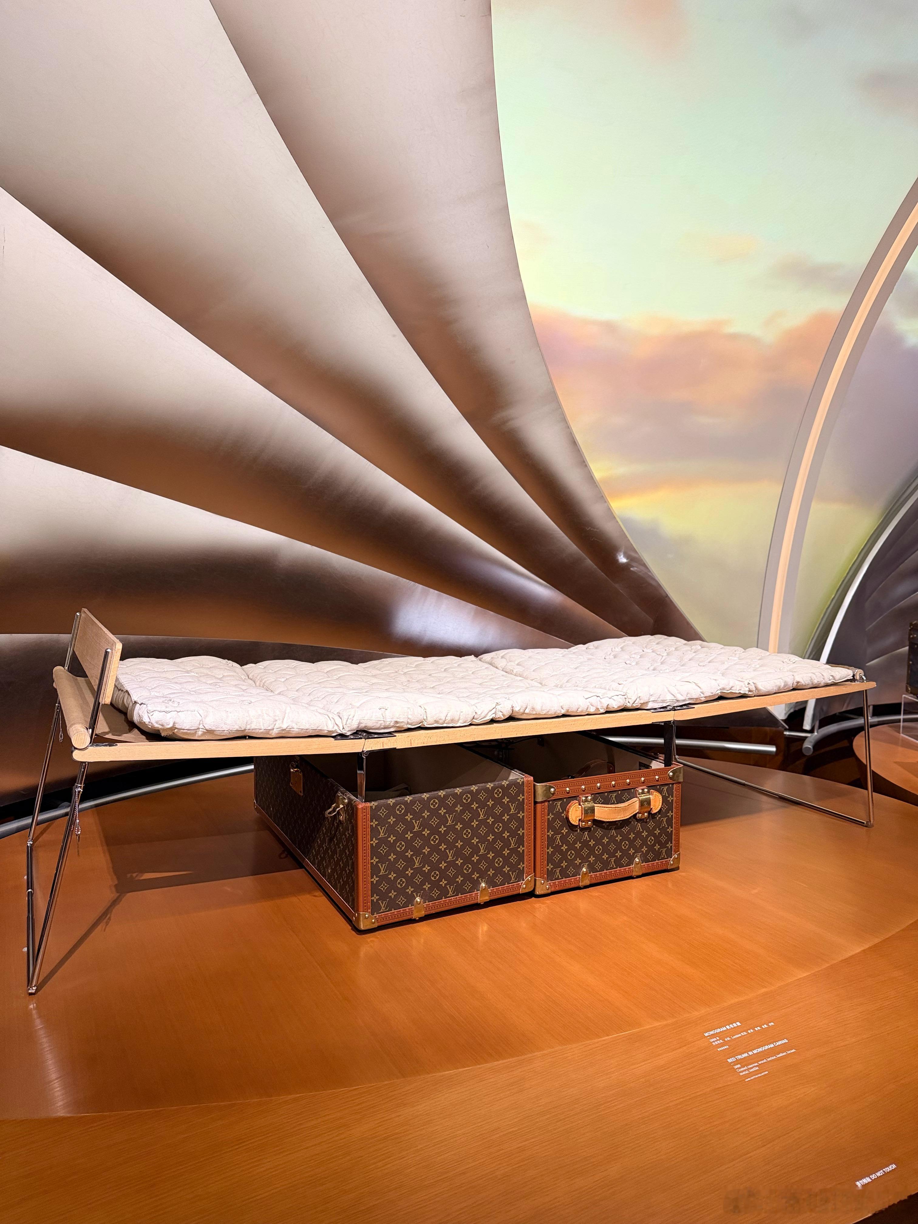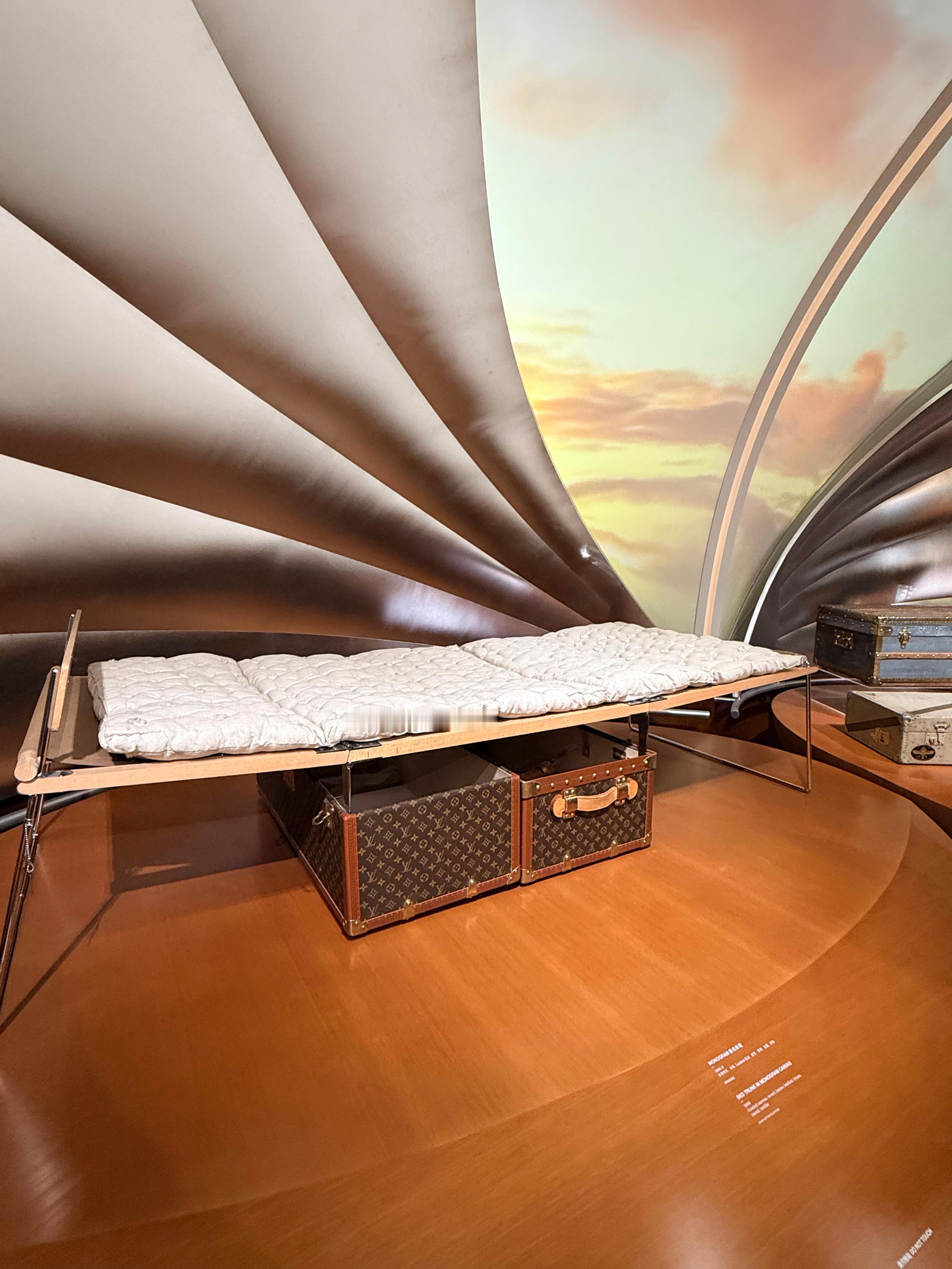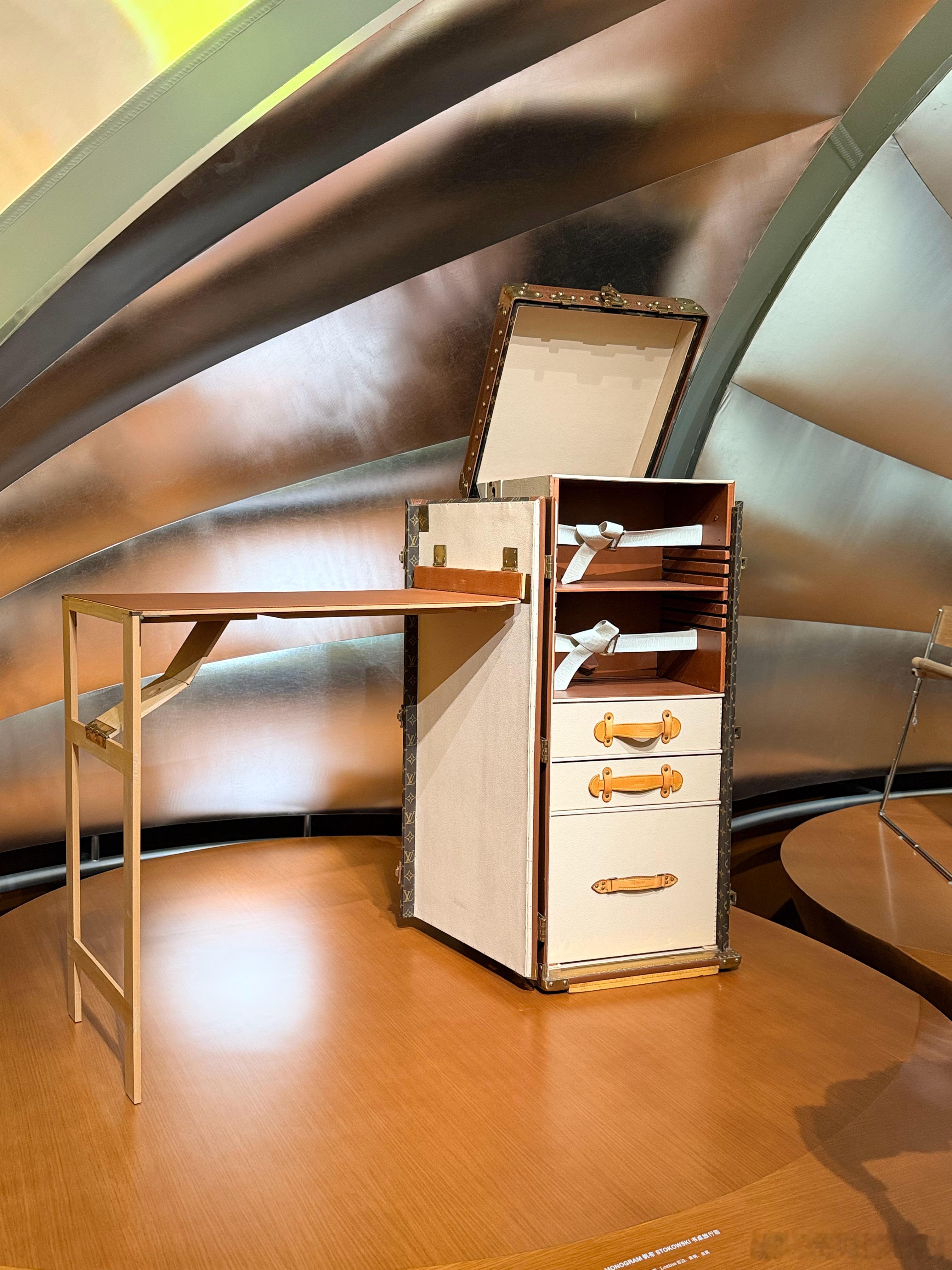 里面基本是lv的各种花式行李箱展。这一百多年的时间里,他们做了一大堆满足各种需求的行李箱。比如可以变成床的行李箱,是给那时候的探险家用的。加厚的硬质行李箱,是为当时欧洲开车去北京的挑战用的。变成书桌的行李箱,是为作曲家随时随地创作用的。能装打字机的行李箱,是给海鸣威定制的。等等等等。很有意思。