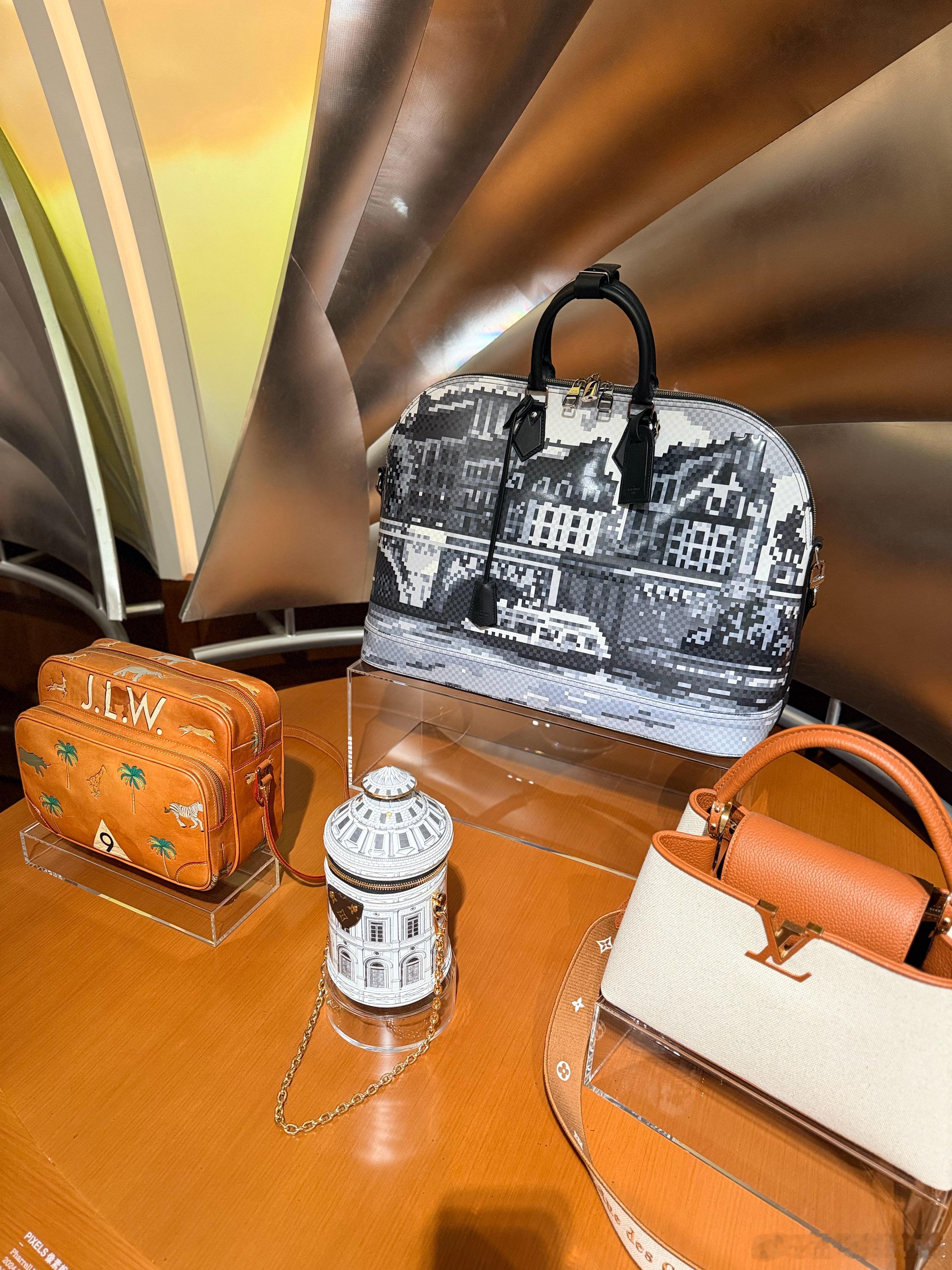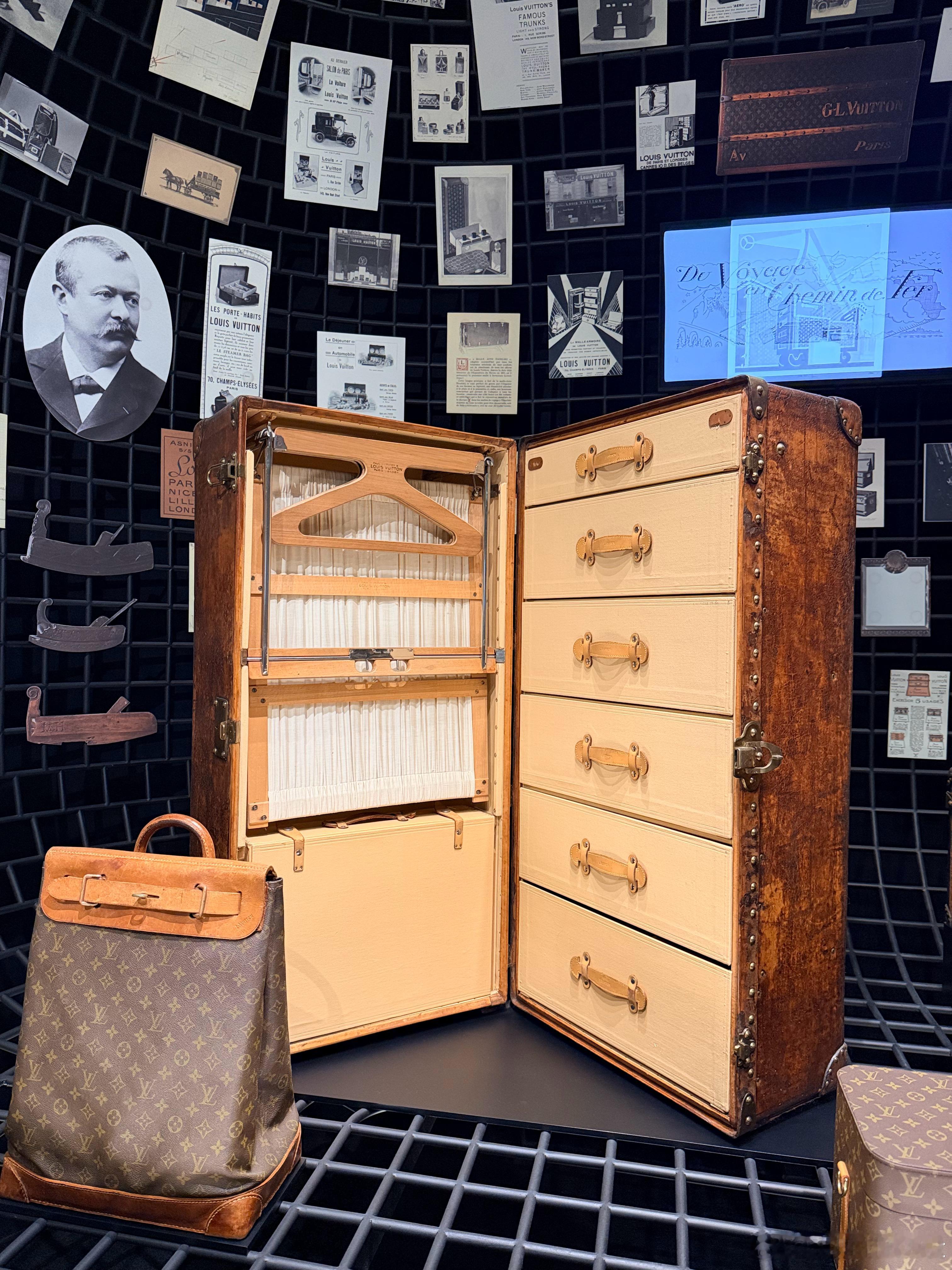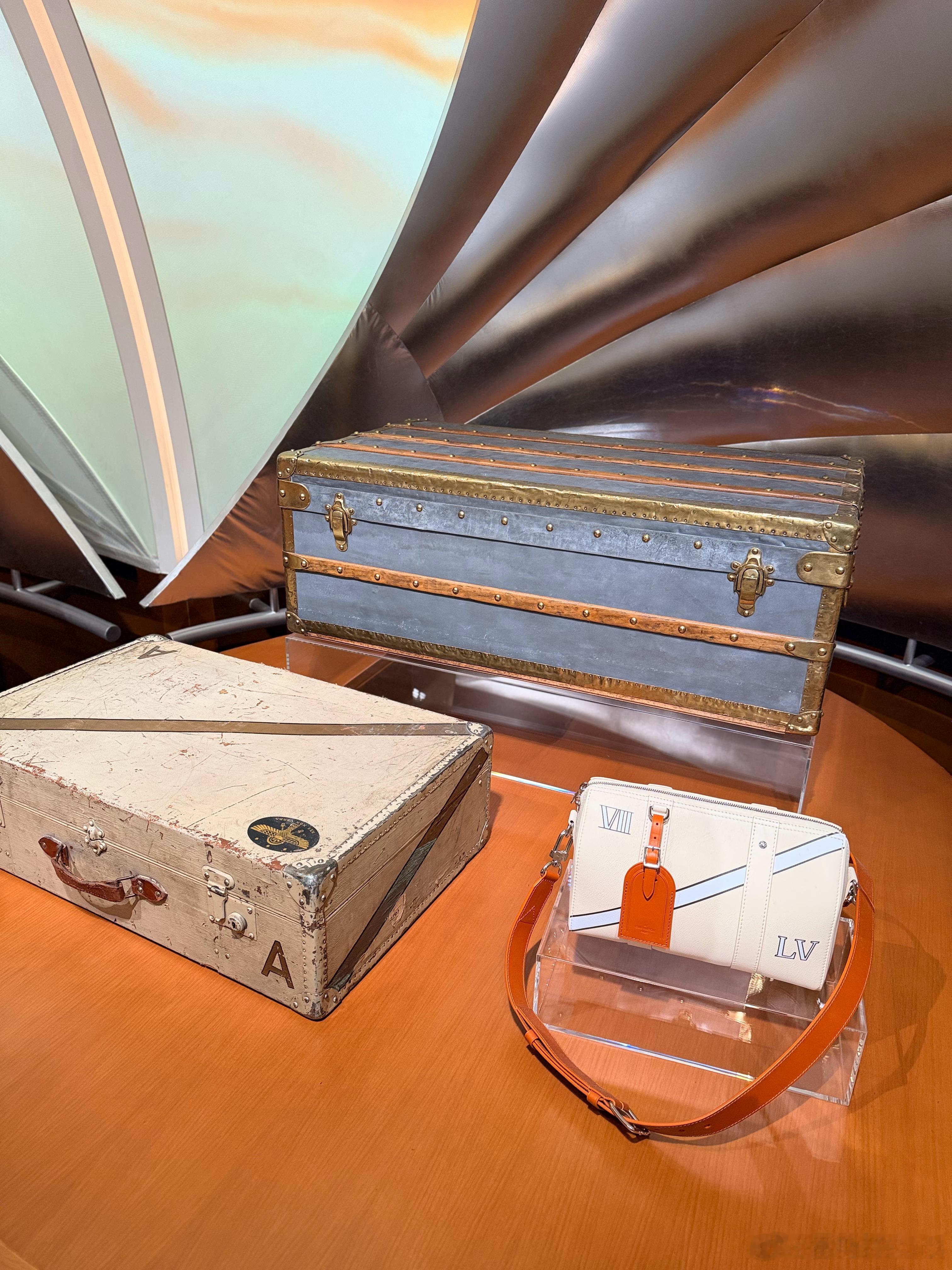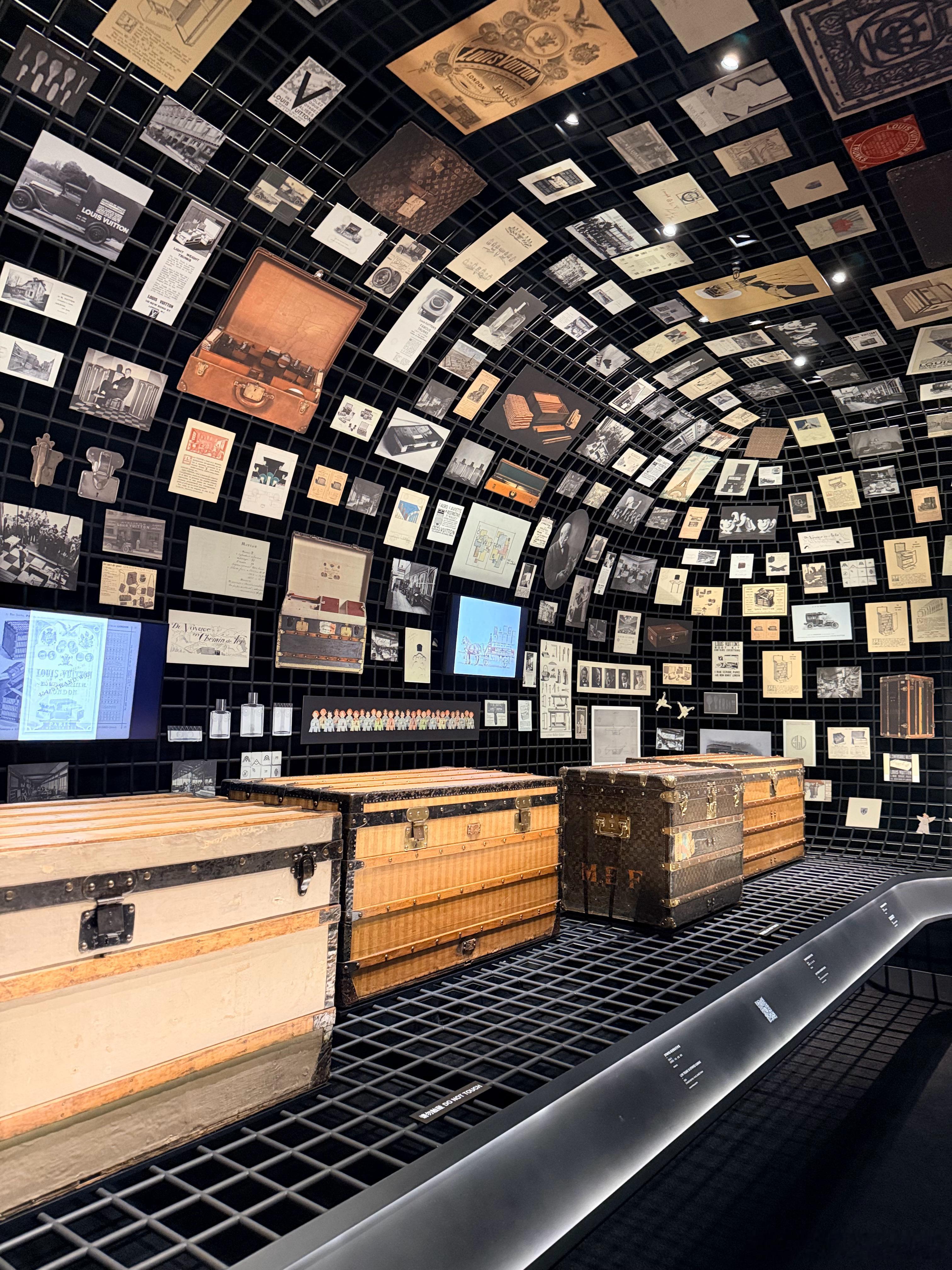 里面基本是lv的各种花式行李箱展。这一百多年的时间里,他们做了一大堆满足各种需求的行李箱。比如可以变成床的行李箱,是给那时候的探险家用的。加厚的硬质行李箱,是为当时欧洲开车去北京的挑战用的。变成书桌的行李箱,是为作曲家随时随地创作用的。能装打字机的行李箱,是给海鸣威定制的。等等等等。很有意思。