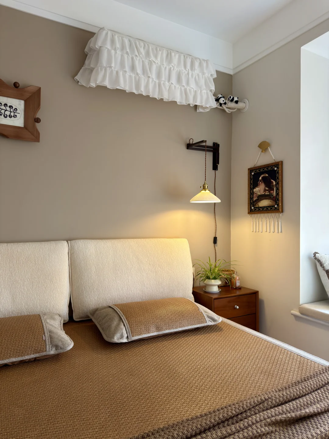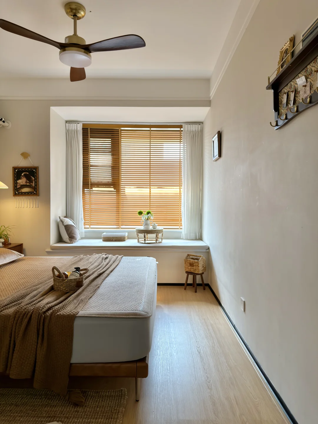 硬装很简单,软装是我喜欢的中古色系,保留了飘窗延伸空间,挂画和氛围灯做点缀,这样搭配真的既实用又好看~