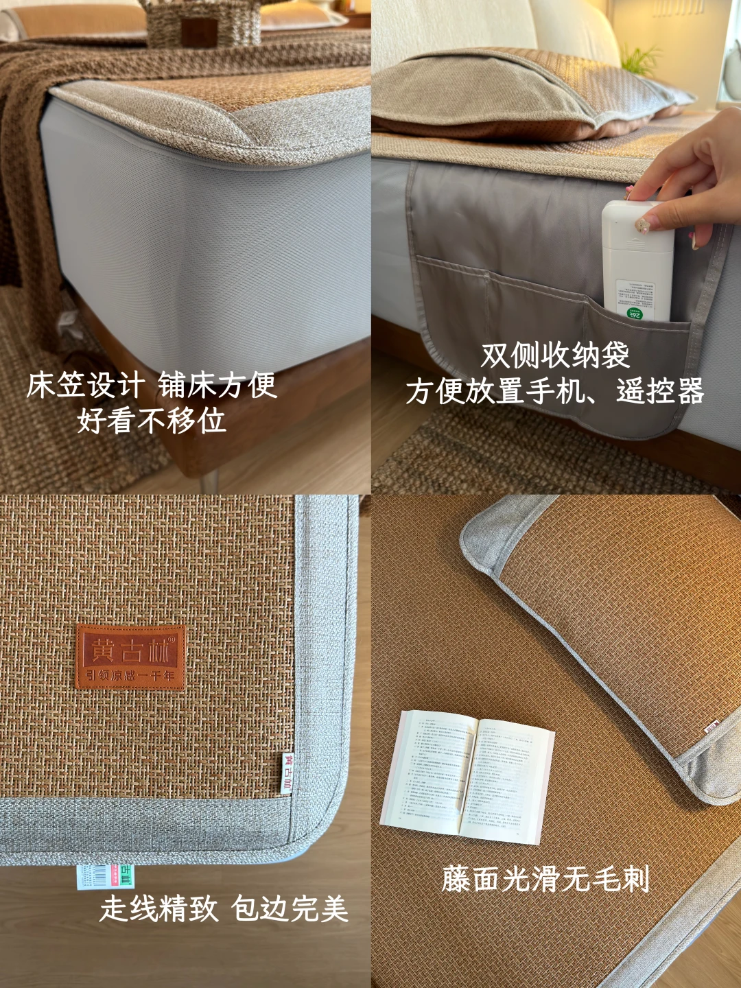 除此之外,它加粗加密的编织肉眼可见的扎实,用个三五年也不会松垮变形。床边的多功能储物袋也很实用,手机、遥控器、睡前读的书随手一放,再不用半夜摸黑找东西。清洁更是省心——湿毛巾轻轻一擦,汗渍灰尘就没了,不用搬来搬去暴晒,也不用担心发霉了