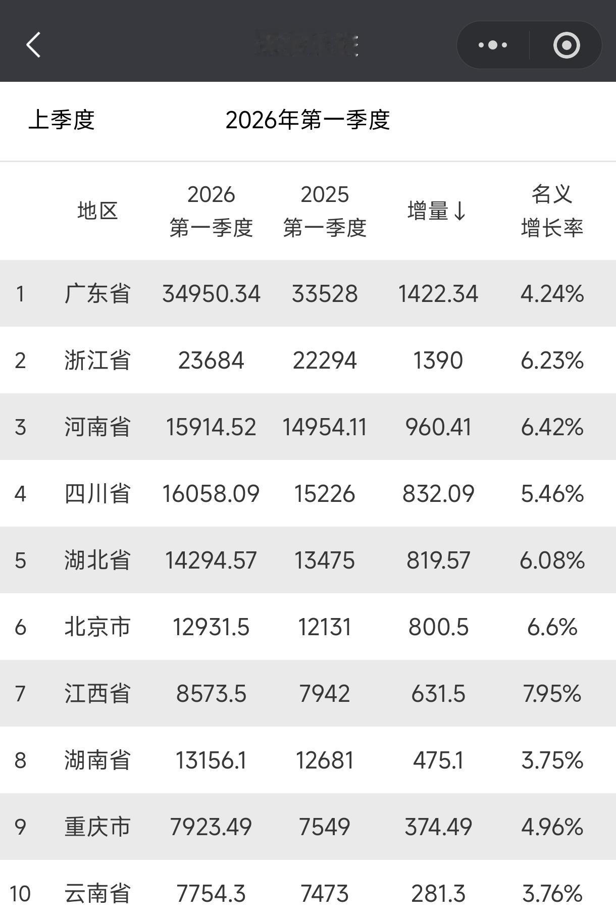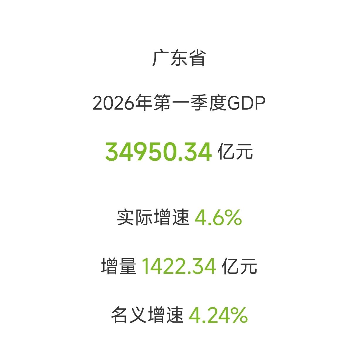 广东省2026年一季度GDP为34950.34亿元,同比增长4.6%,增量142