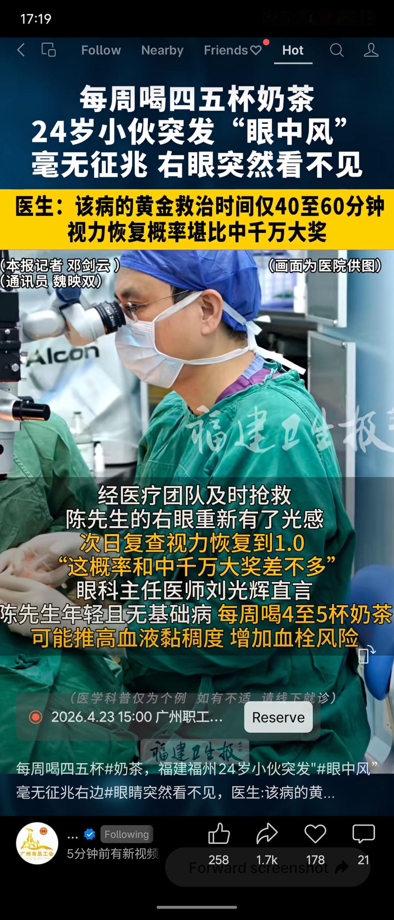 福建福州24岁小伙每周喝4-5杯奶茶,突发右眼“眼中风”(视网膜中央动脉阻塞),黄金救治仅40-60分钟。所幸10分钟内就医,视力奇迹般恢复至1.0。医生指出,高糖高脂饮食可能推高血液黏稠度,增加血栓风险。此事警示:年轻人也需控制糖脂摄入,单眼无痛性视力骤降须立即就医,切莫延误。