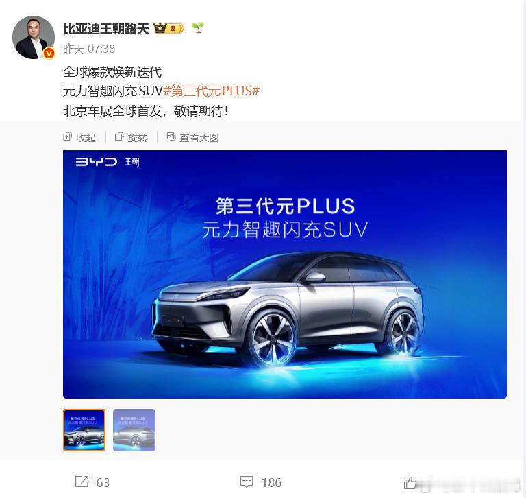 比亚迪第三代元PLUS将北京车展首发 近日,比亚迪王朝网销售事业部总经理透露,第三代元PLUS将于2026北京车展 全球首发,新车定位“元力智趣闪充SUV”。