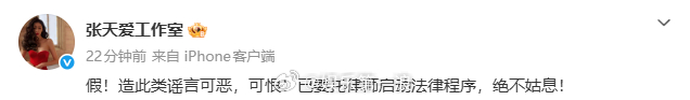 5、4月21日,回应:“假!造此类谣言可恶,可恨!已委托律师启动法律程序,绝不姑息!” 张天爱