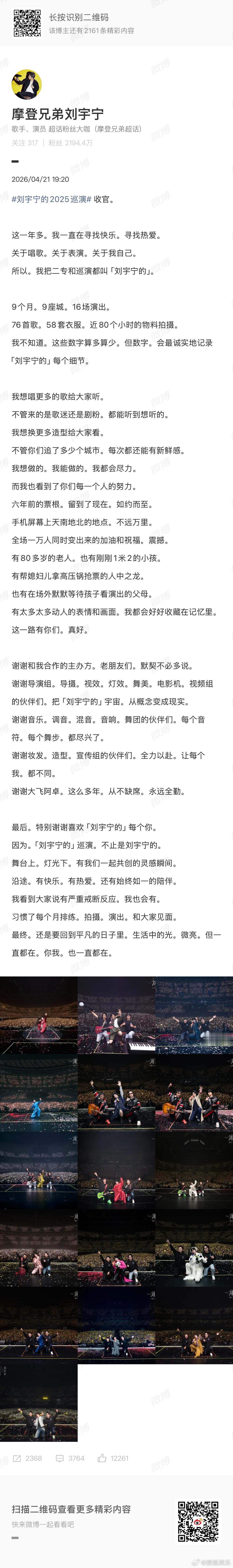 刘宇宁二巡收官发文 发文纪念「刘宇宁的」2025巡演正式收官!9个月、9座城、16场演出、76首歌、58套衣服以及近80个小时的物料拍摄,诚实地记录下了巡演的每个细节。收官快乐!下次见