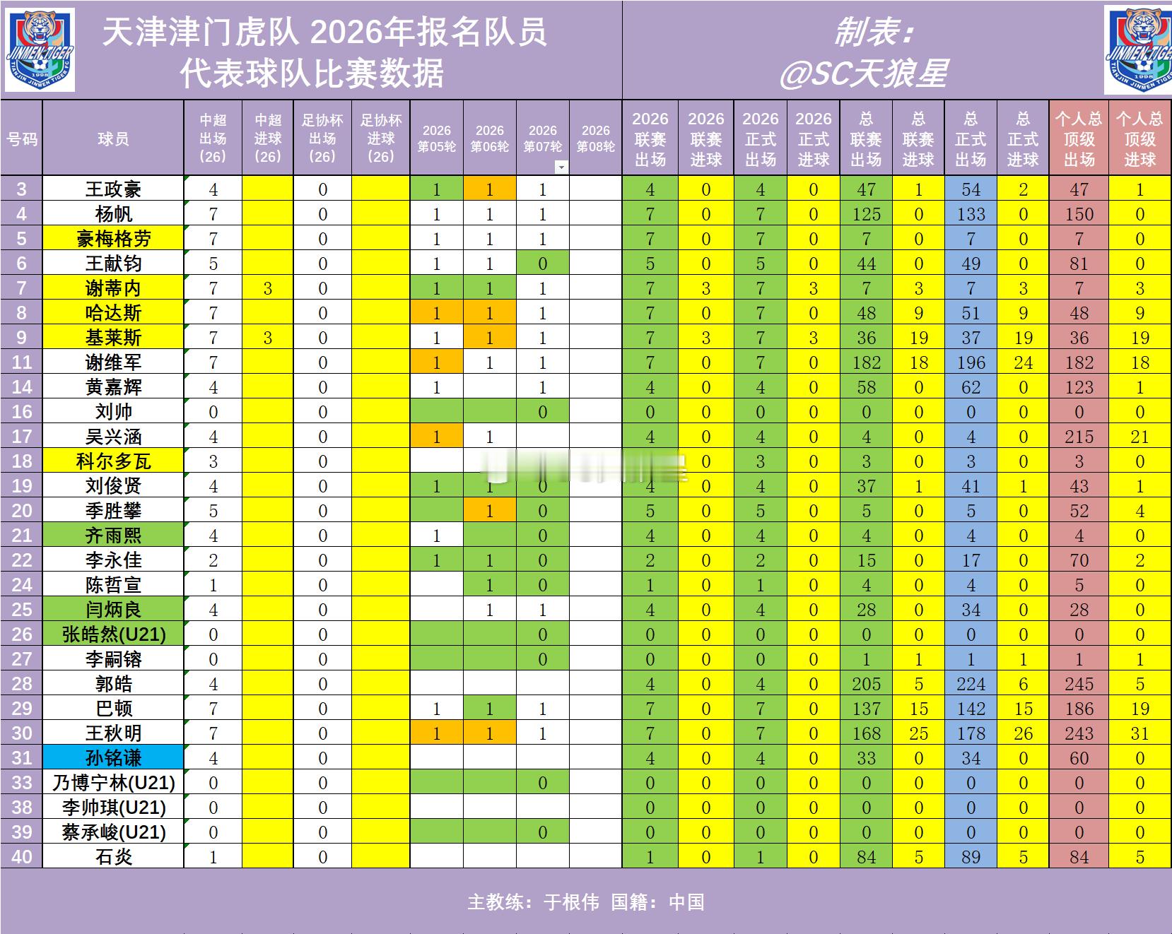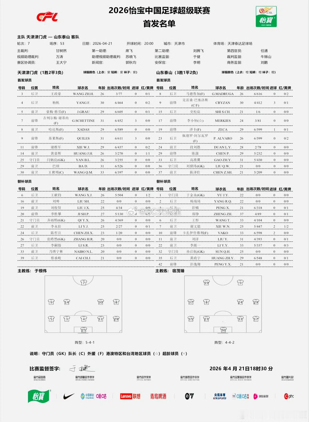 2026年中超 第07轮 天津津门虎队出场数据