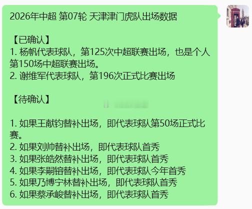 【已确认】1. 杨帆代表球队,第125次中超联赛出场,也是个人第150场中超联赛出场。2. 谢维军代表球队,第196次正式比赛出场