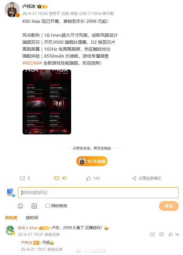 卢伟冰说这个价格亏损不赚钱,米粉们支持嘛红米发布会