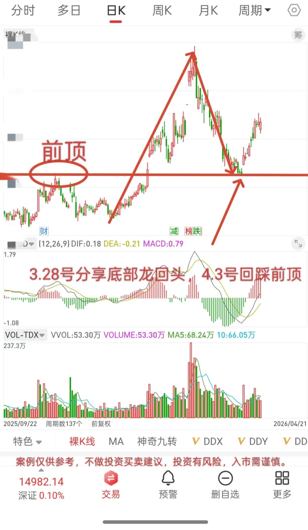 这是指数,而一旦指数回踩到位,那个股,特别是底部龙回头个股,基本全部都会回踩到位,3.23号那天,很多底部龙回头见底(回踩前顶),4.3号那天也有很多底部龙回头见底(回踩前顶)。